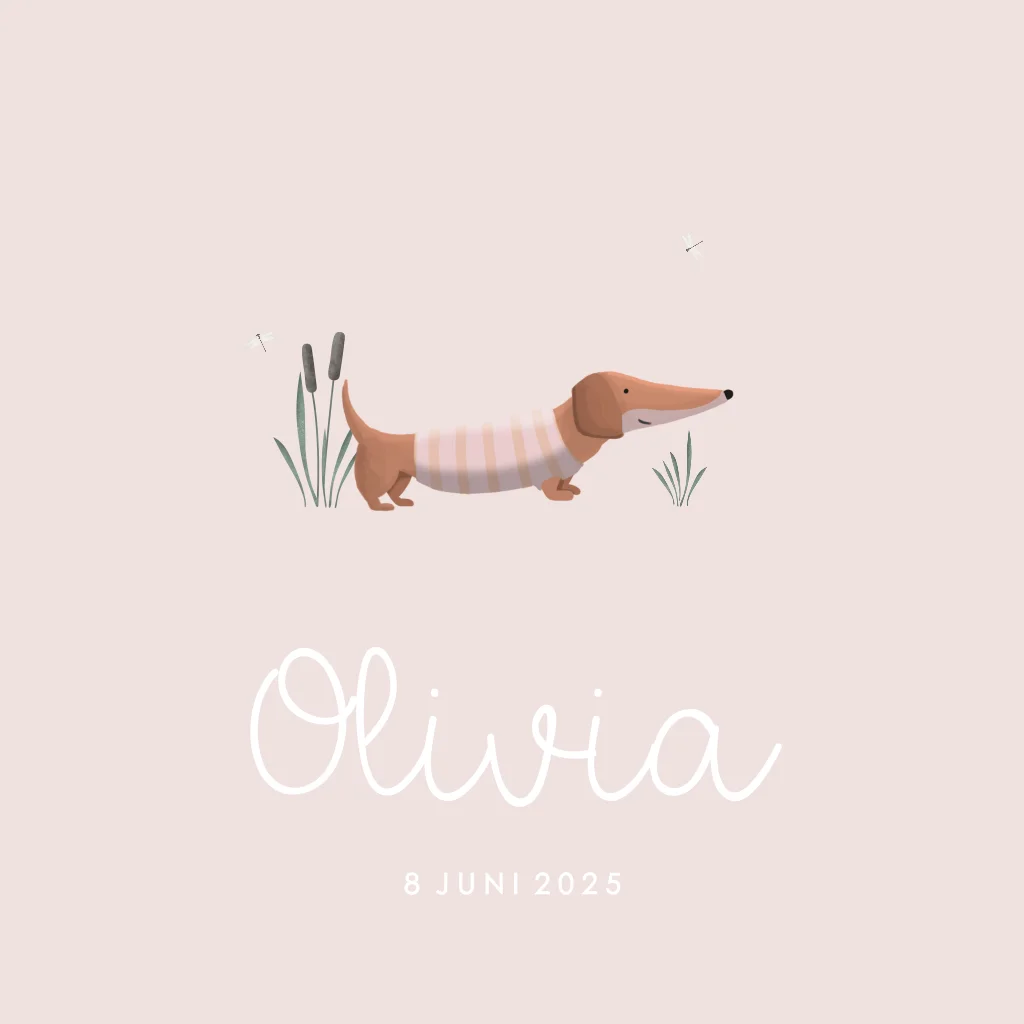 Een lief en vrolijk geboortekaartje voor jouw meisje. Het kaartje heeft een vierkant formaat met een licht roze achtergrond. Daarop zie je een illustratie van een teckel met een gestreept truitje aan die door de natuur loopt. Pas het kaartje naar wens aan in onze online editor.
