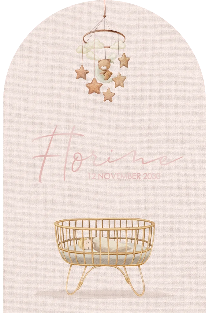 Lief geboortekaartje met mobiel en wieg in beige tinten. Pas het ontwerp aan in onze online editor.