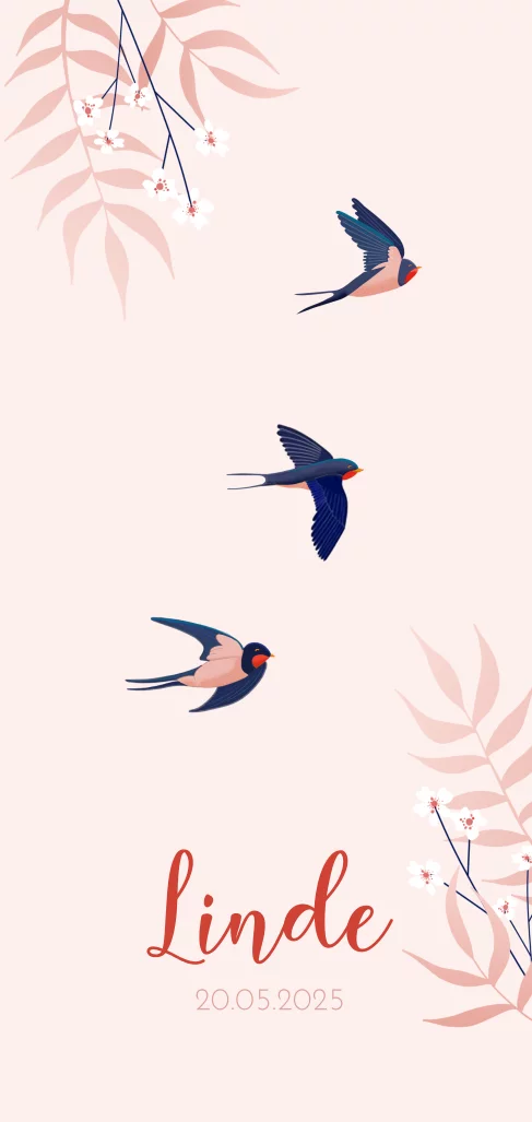 Een lief kaartje om de geboorte van jullie dochtertje mee te vieren. De achtergrond is lichtroze en in twee hoeken zijn mooie bladeren in verschillende tinten te zien. De vliegende zwaluwen in het midden trekken meteen de aandacht.