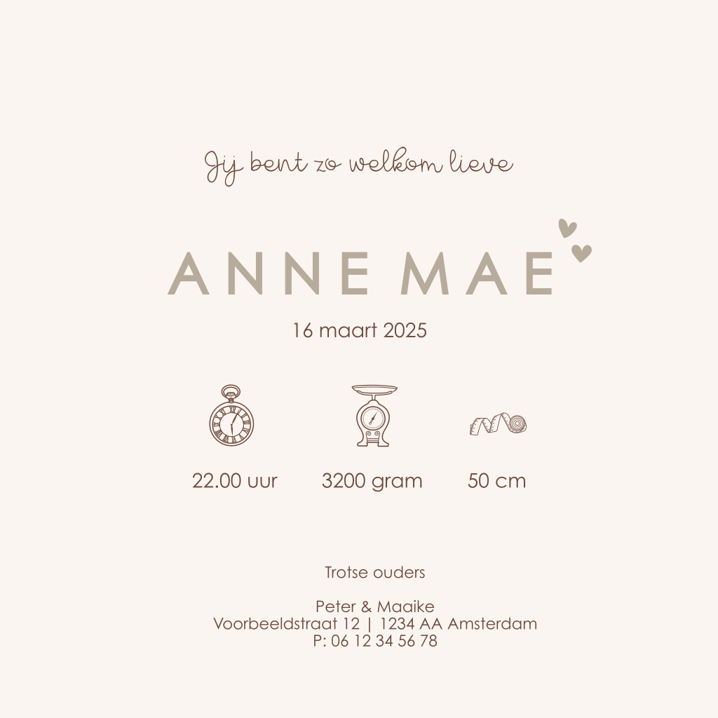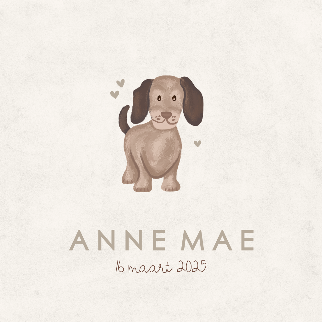Een origineel geboortekaartje voor jullie meisje. Het kaartje heeft een velvet-look bruine achtergrond. Op de voorgrond zie je een schattige illustratie van een teckel. Pas het kaartje naar wens aan in onze online editor.