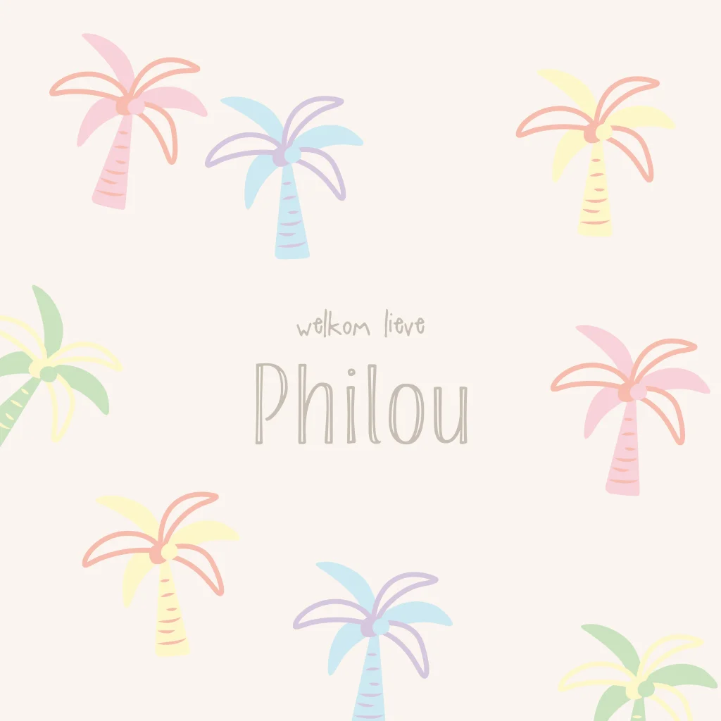 Een zomers en vrolijk geboortekaartje voor de geboorte van jullie dochtertje. Het kaartje heeft een zandkleurige achtergrond met daarop vrolijk gekleurde palmboompjes in zomerse kleuren. De naam van jullie dochtertje staat in het midden van het kaartje in een vrolijk lettertype. Pas de naam van je kindje aan in onze online editor en maak het kaartje naar je eigen wens. Bestel een proefdrukje om het kaartje thuis in het echt te bekijken.