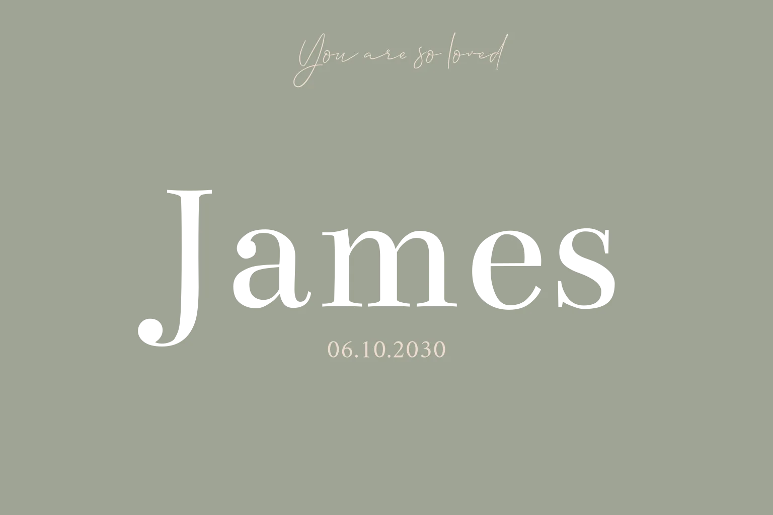 Prachtig grijsgroen geboortekaartje voor een jongen of een meisje. De naam is in koperfolie, maar die kleur kun je eenvoudig aanpassen, net als het lettertype.