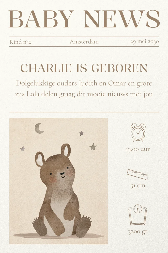 Een schattig krant geboortekaartje in beige tinten en beertje. De krant stijl met het lieve beertje maakt het kaartje origineel, betaalbaar en grappig. Pas het ontwerp naar wens aan in onze online editor. Omdat er nu geen veredeling aan het drukwerk zit (zoals ronde hoeken, hoogglans of folie) is dit een goedkoop geboortekaartje. De veredeling kun je wel naar wens toevoegen in onze editor.