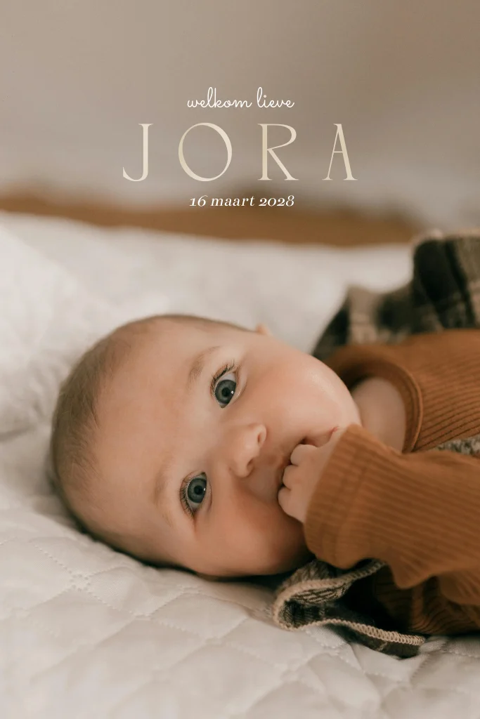 Een lief geboortekaartje met foto in beige tinten en de naam in spot-uv, ook wel hoogglans genoemd. Liever een ander soort folie? Personaliseer makkelijk in onze online editor en vier de geboorte van je kleintje.
