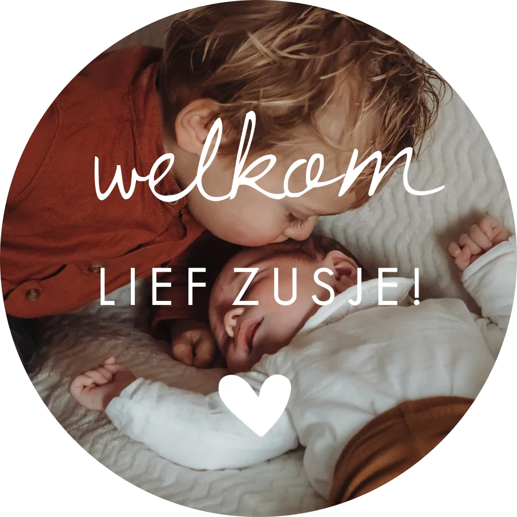 Welkom lief zusje of broertje! Op onze sluitstickers kan je jouw eigen foto plaatsen. Zo lief! Ook de tekst kan zelf aangepast worden. De sticker is perfect voor jouw envelop, doopsuiker of traktatie. De sluitstickers hebben een diameter van 35 mm en worden geleverd op vellen van 25 stuks.