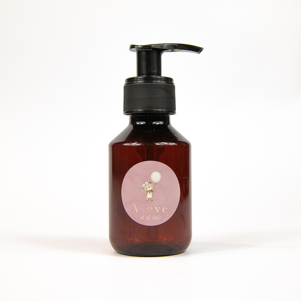 Roze naamsticker voor doopsuiker met de lieve illustratie van een beer en bloemetjes.