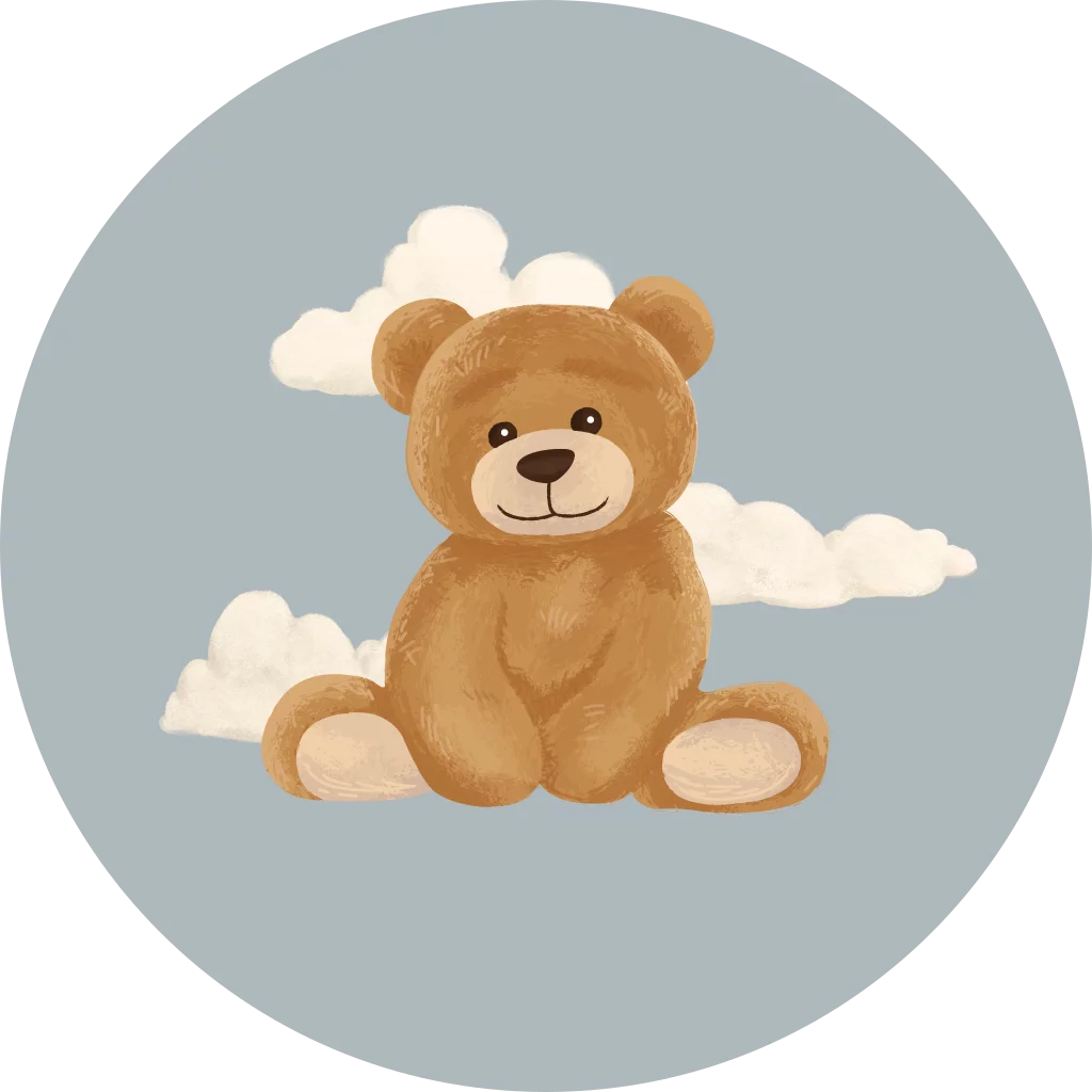 Een schattige sluitsticker met blauwe achtergrond en een teddybeer tussen de wolken. De sticker is volledig naar wens aan te passen in onze online editor.