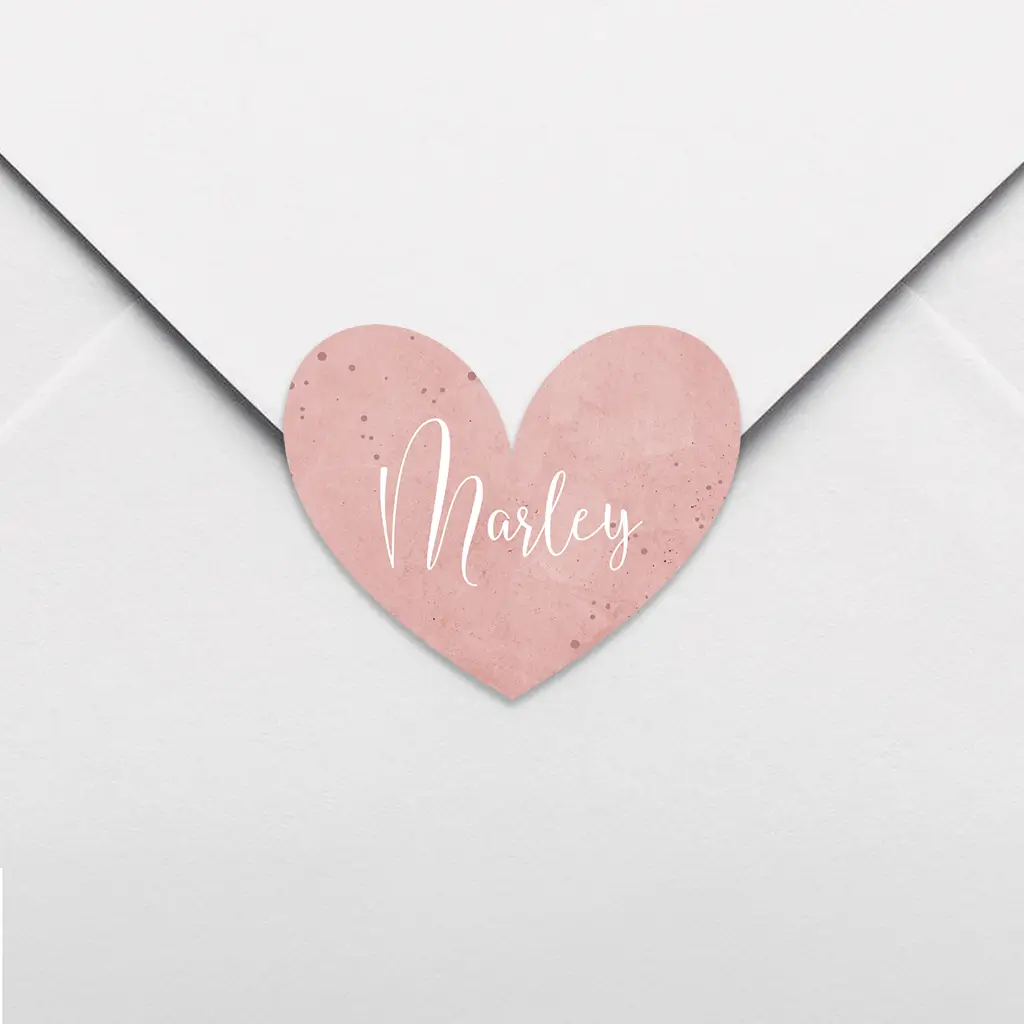 Dit is een mooie sluitsticker. De sluitsticker heeft de vorm van een hart met een roze velvet-look achtergrond. De spetters geven deze sluitsticker een feestelijk effect.