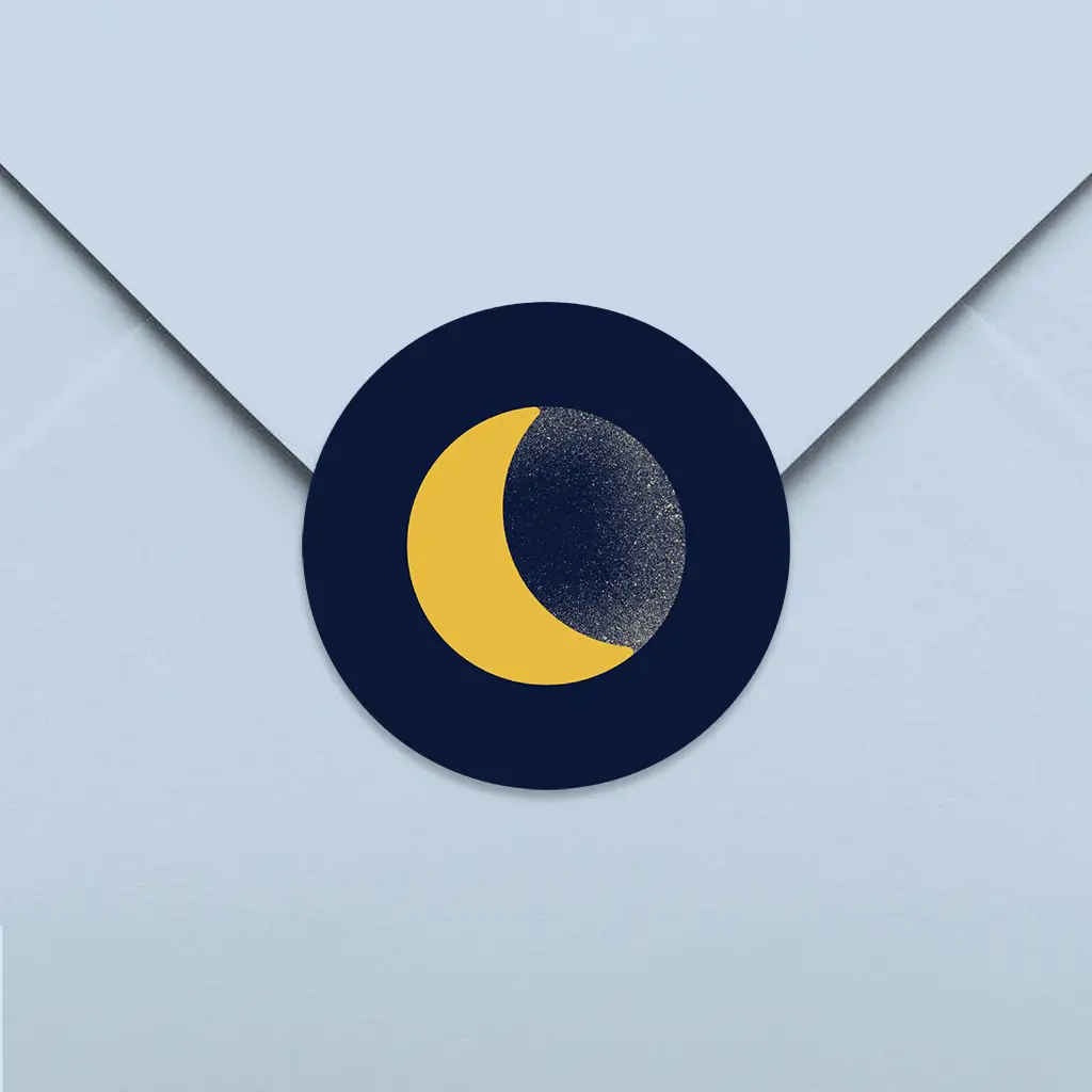 Een mooie sluitsticker van een halve maan in de nachtblauwe lucht. Wil je de achtergrondkleur aanpassen? Dat kan gemakkelijk in onze online editor.