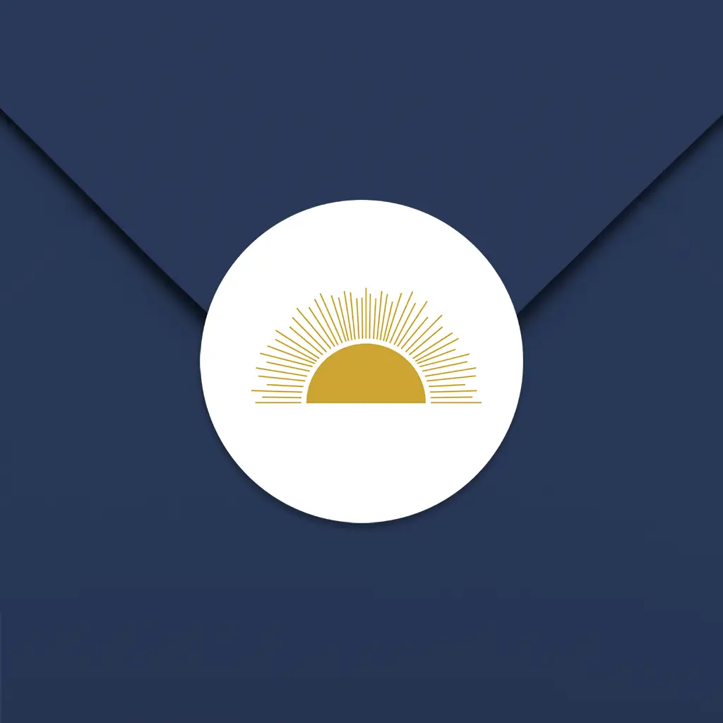 Een stijlvolle sluitsticker met een opkomende zon. Het ontwerp is passend voor jouw geboortekaartje, uitnodigingen of doopsuikers.