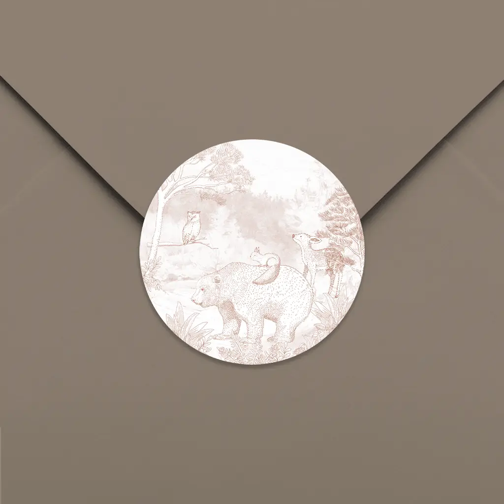 Sluitzegel bij het geboortekaartje met bosdieren, een snelle manier om de envelopjes te sluiten en nog eens mooi ook! Op de witte achtergrond staat een bruine tekening van dieren in het bos: een beer, hertje, eekhoorn en een uil.