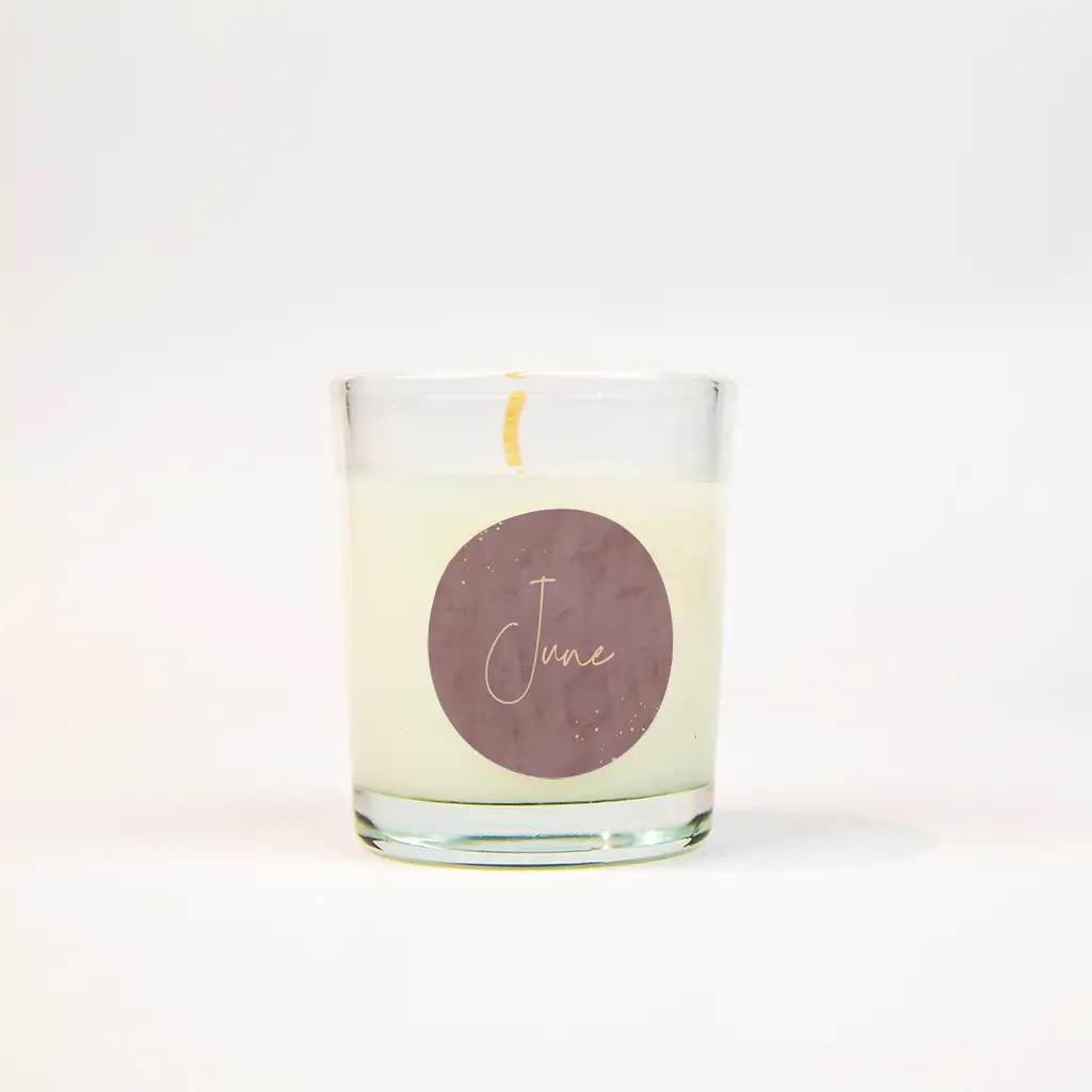 Minimalistische naamsticker met een paarse velvet-look achtergrond. Plaats de naam of initialen van jouw kleintje op de sticker in onze online editor.