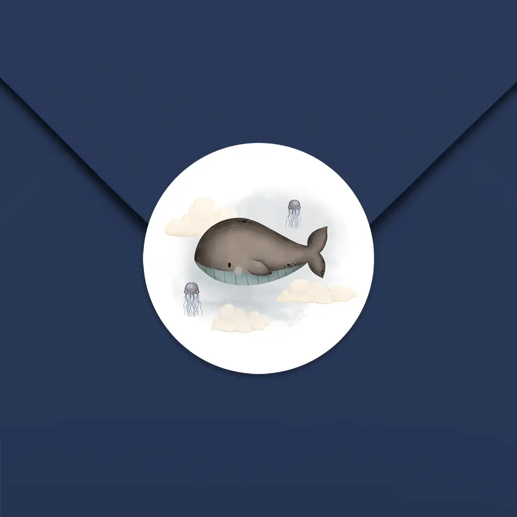 Een lieve sluitsticker passend bij het geboortekaartje van jouw kleintje. Op de sticker zie je een walvis omringd door wolkjes en twee kwallen. De achtergrond heeft een watercolour. Pas de sticker naar wens aan in onze online editor.