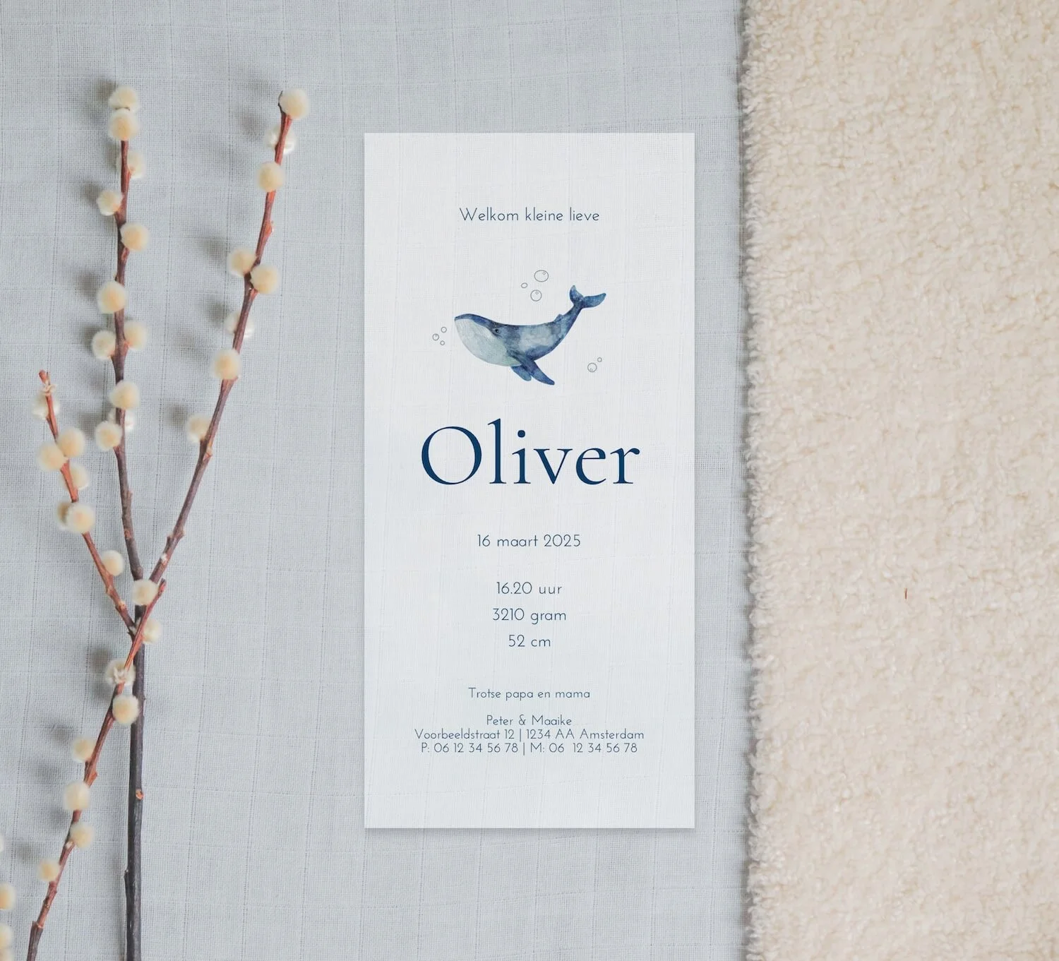 Stoer geboortekaartje van kalkpapier voor de geboorte van je zoontje. Op het kaartje staat een walvis afgebeeld met daaronder de naam van je kindje in een lichtblauwe kleur. Ook staat de geboorte tijd, gewicht en lengte van je kindje op de kaart met leuke bijpassende illustraties.