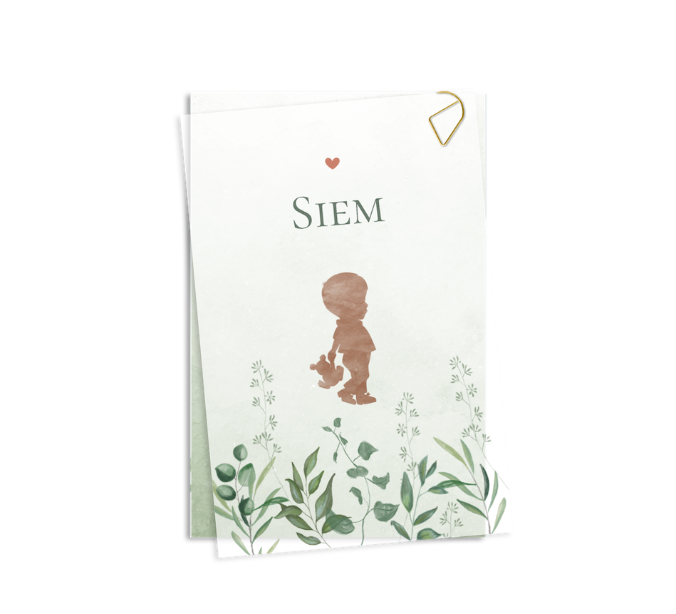 Een lief geboortekaartje met een silhouetjes en takjes. Het kaartje heeft een kalkpapier voorblad en een papieren achterblad. Pas het ontwerp naar wens aan in onze online editor.