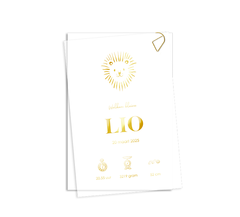 Een hip geboortekaartje voor jouw kindje. Het kaartje heeft goudfolie details met o.a. een leeuwtje. Pas het ontwerp naar wens aan in onze online editor.