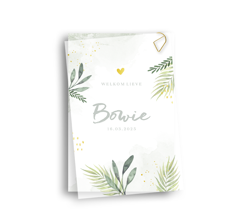 De paperclips worden niet standaard meegeleverd, dit kun je gemakkelijk zelf toevoegen tijdens het bestelproces. Je vindt alle bevestigingsmaterialen hier. Wanneer je de geboortekaartjes ontvangt, kun je het kaartje zelf in elkaar zetten met de gekozen paperclips.