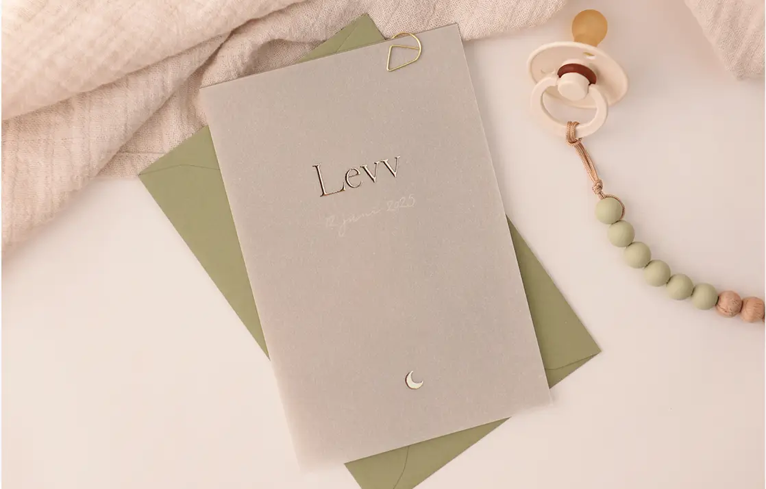 Kalkpapier geboortekaartje met goudfolie babynaam en maantje