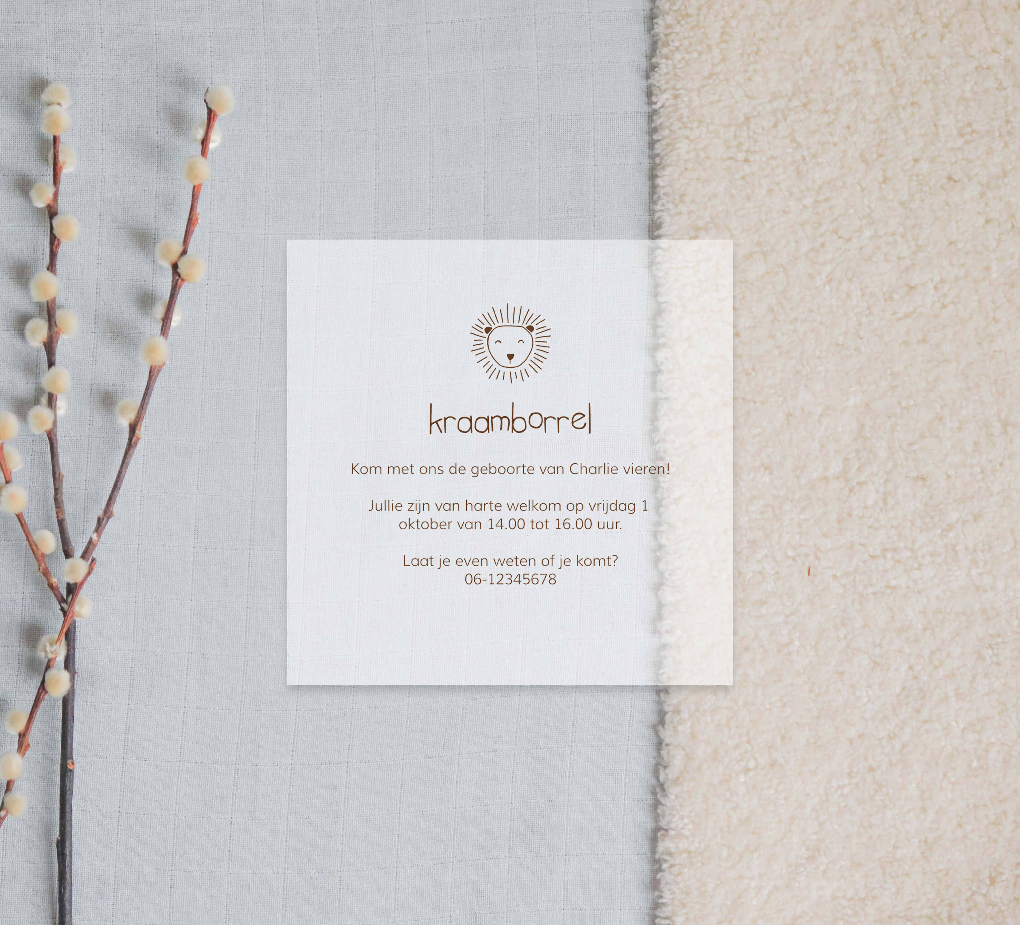 Vier de geboorte met een kraamborrel! Deze kalkpapier uitnodiging is een unieke manier om de gasten uit te nodigen. Het kaartje heeft een vrolijke illustratie van een leeuwtje.