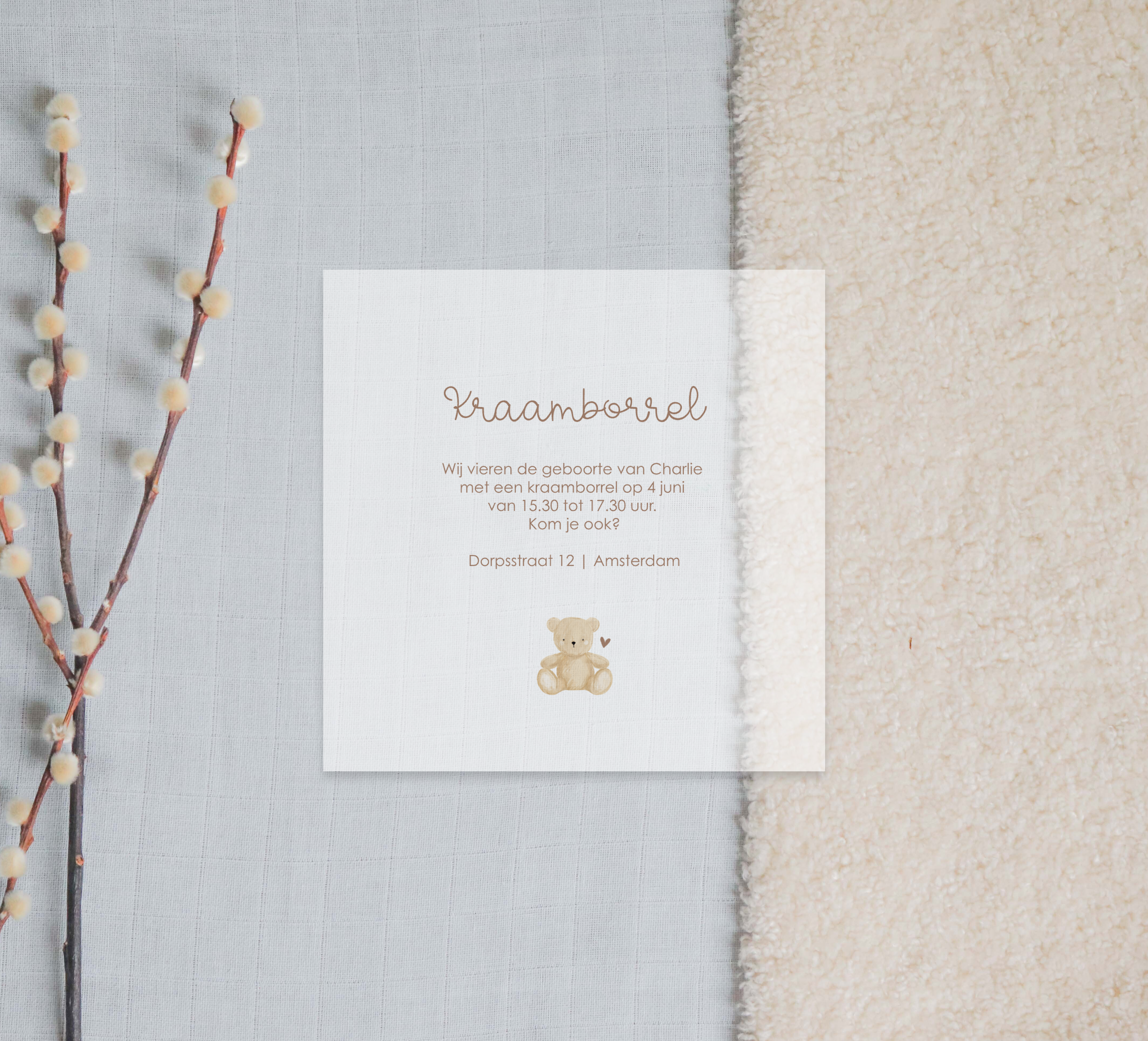 Kalkpapier kraamborrel uitnodiging met lief beertje