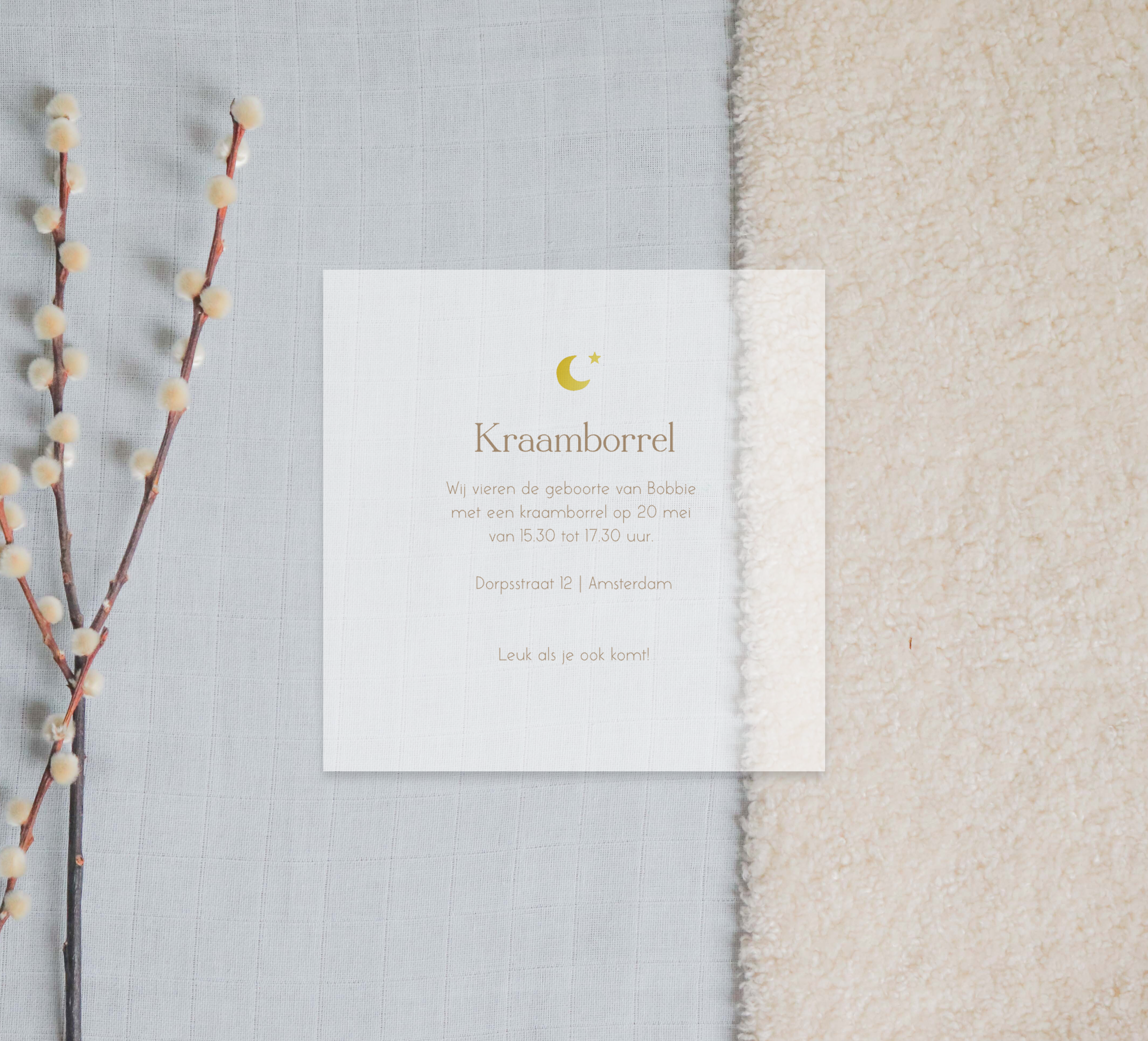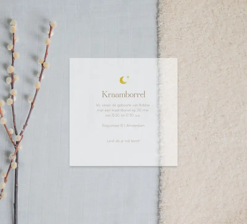 Vier de geboorte met een kraamborrel! Deze kalkpapier uitnodiging is een unieke manier om de gasten uit te nodigen. Het kaartje heeft een minimalistische uitstraling met een goudfolie maantje.