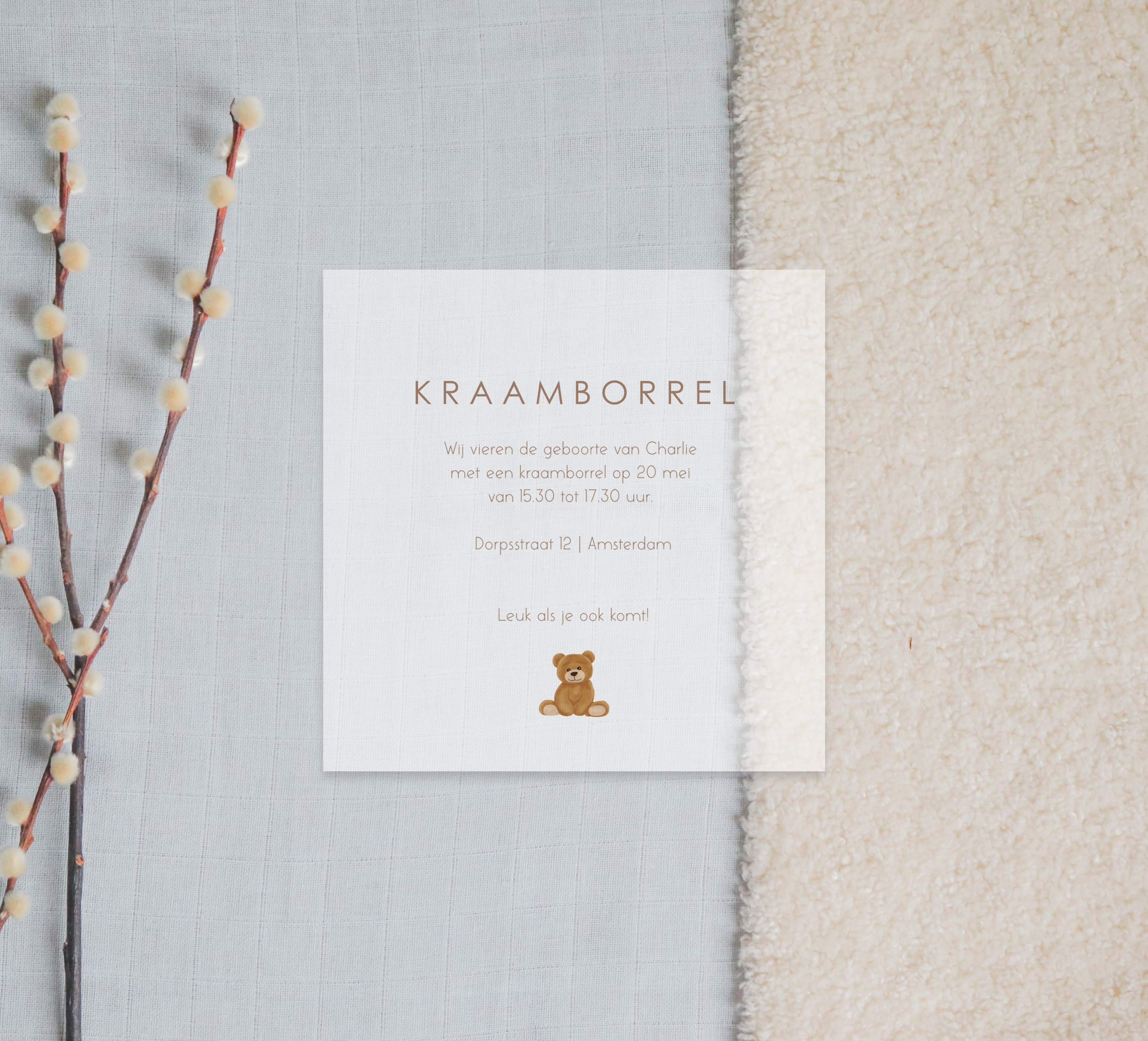 Vier de geboorte met een kraamborrel! Deze kalkpapier uitnodiging is een unieke manier om de gasten uit te nodigen. Het kaartje heeft een lieve illustratie van een teddybeer.
