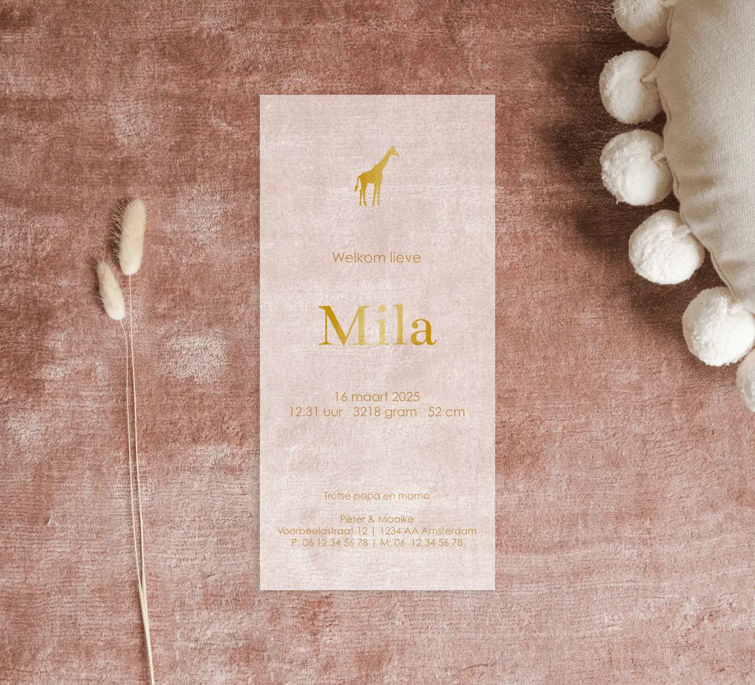 Stijlvol geboortekaartje voor jongen of meisje van kalkpapier met goudfolie silhouet van een giraffe. Dit kaartje wordt enkelzijdig gedrukt en het goudfolie maakt dit echt een unieke geboortekaartje! Pas het kaartje aan naar jullie wensen in de editor.