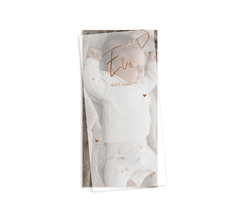 Een romantisch geboortekaartje voor een meisje. Het kaartje heeft een kalkpapier voorblad met roségoudfolie details. Pas het ontwerp naar wens aan in onze online editor.