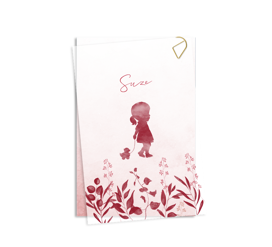 Een romantisch geboortekaartje voor een meisje. Het kaartje heeft roze tinten met een silhouetje. Het kaartje heeft een kalkpapier voorblad en een papieren achterblad.
