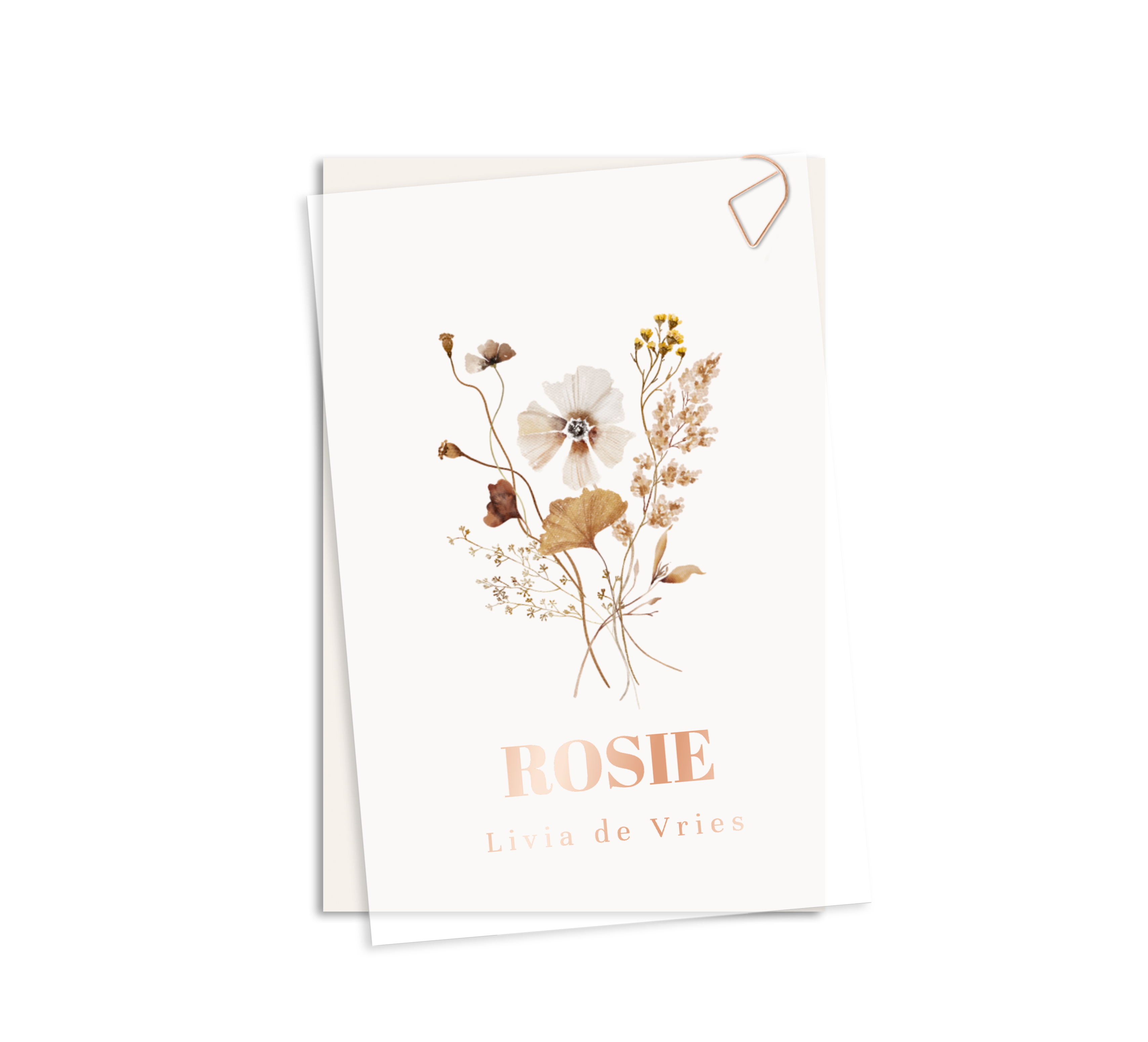 Een stijlvol geboortekaartje voor jouw kindje. Het kaartje heeft prachtige illustraties van bloemen. De naam wordt gedrukt in roségoudfolie op het kalkpapier voorblad. Pas het ontwerp naar wens zelf aan.