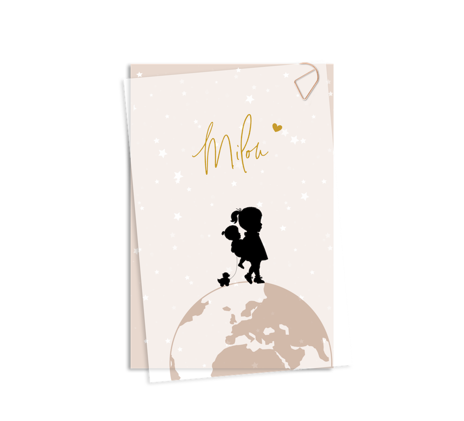 Kalkpapier geboortekaartje met silhouetjes op wereldbol