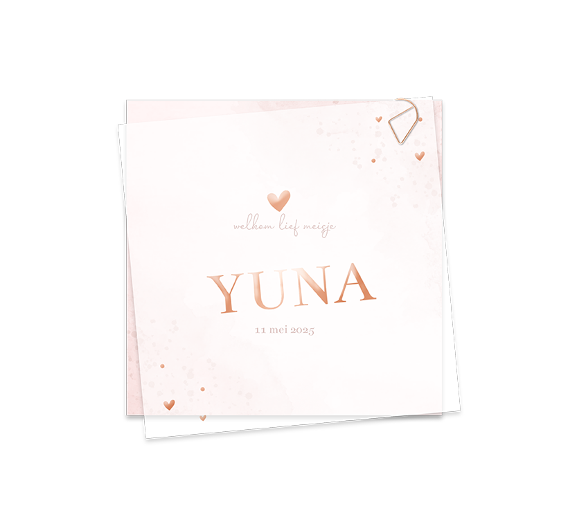 Een lief geboortekaartje voor een meisje. Het kalkpapier geboortekaartje heeft roségoudfolie hartjes en naam. Het achterblad heeft roze watercolour.