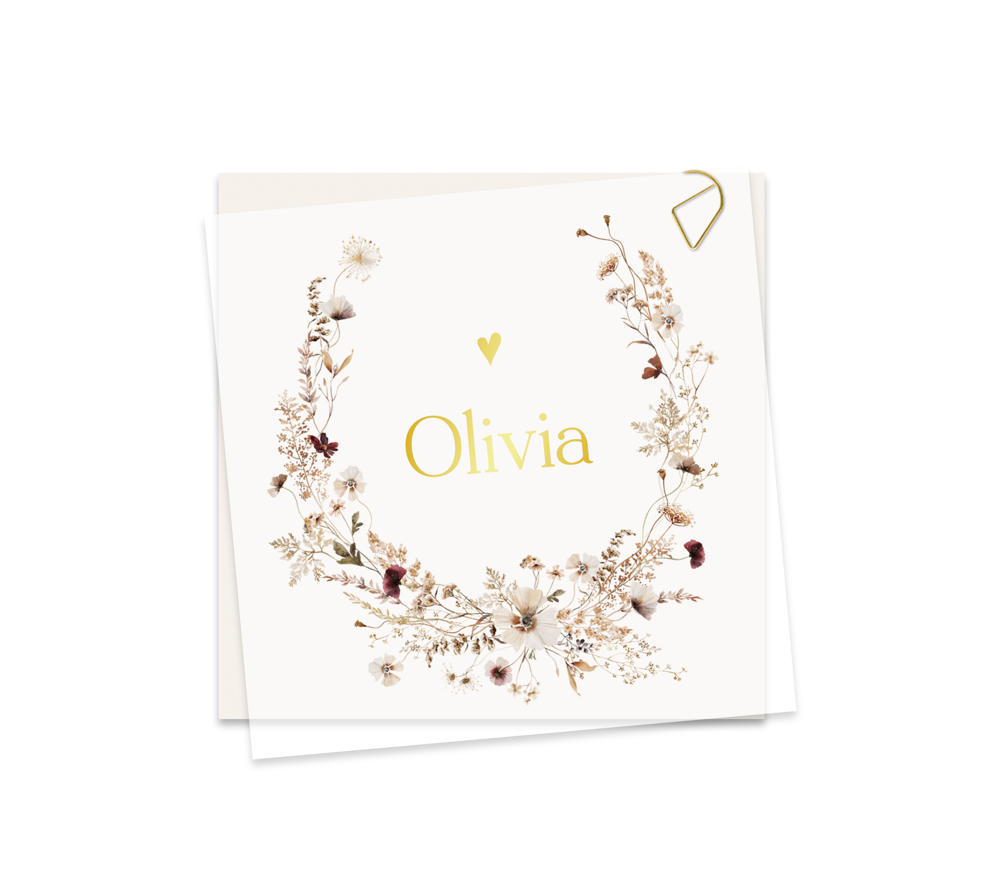Een stijlvol geboortekaartje voor jouw kindje. Het kalkpapier voorblad heeft een prachtige bloemenkrans met goudfolie naam. Het kaartje heeft een kalkpapier voorblad en een papieren achterblad.