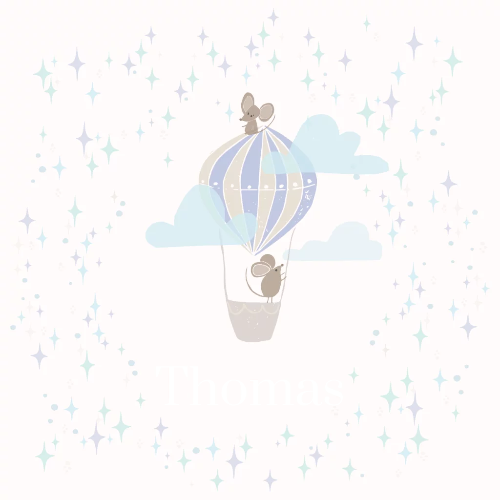 Een lief kaartje voor jouw kindje. Het kaartje heeft een luchtballon omringd door sterretjes en muisjes. De illustraties worden gedrukt in pasteltinten. De naam schittert in goudfolie. Pas het ontwerp naar wens aan.