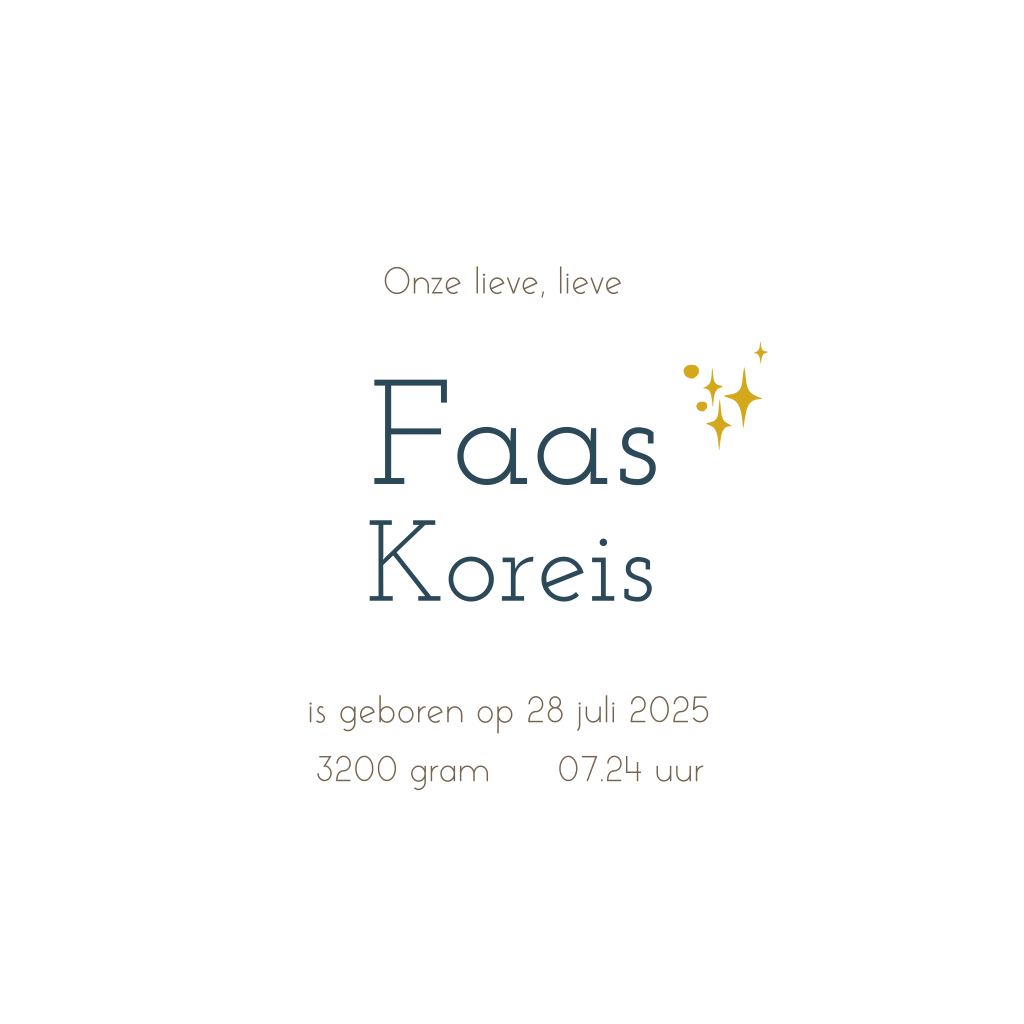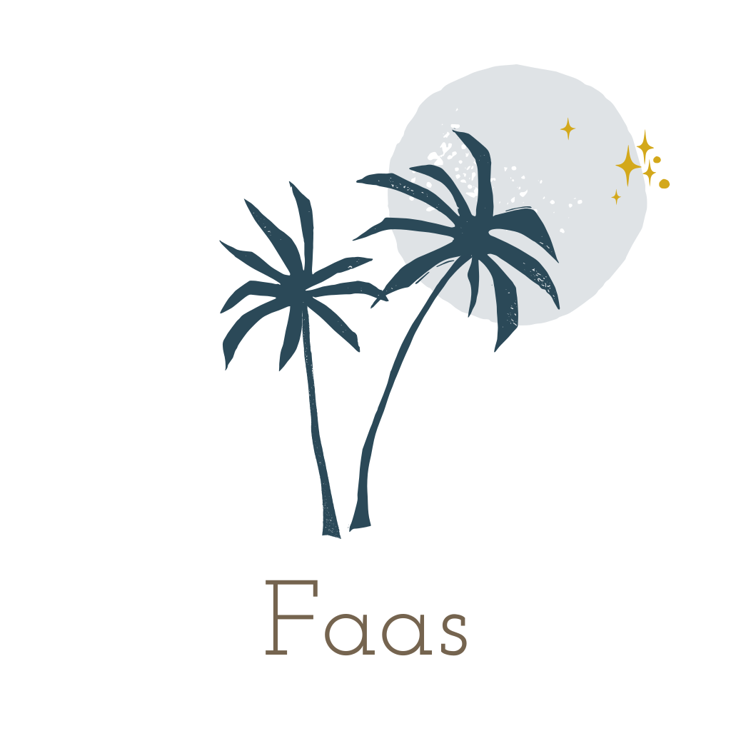 Uniek geboortekaartje gemaakt met handgesneden stempels. Met palmbomen, maan en goudkleurige sterretjes op een witte achtergrond. Door het eenvoudige ontwerp heeft dit kaartje een natuurlijke, stijlvolle uitstraling. Je kunt dit kaartje nog helemaal naar wens aanpassen in de online editor.