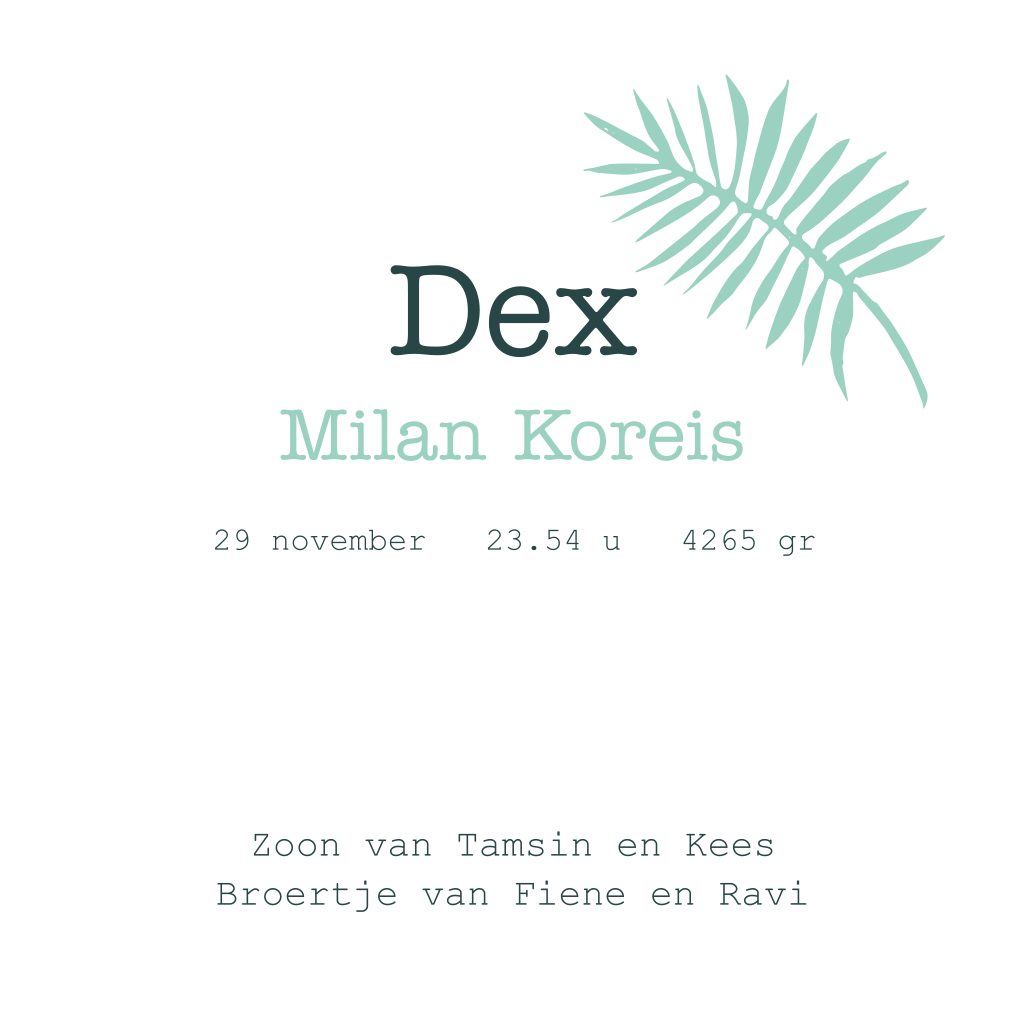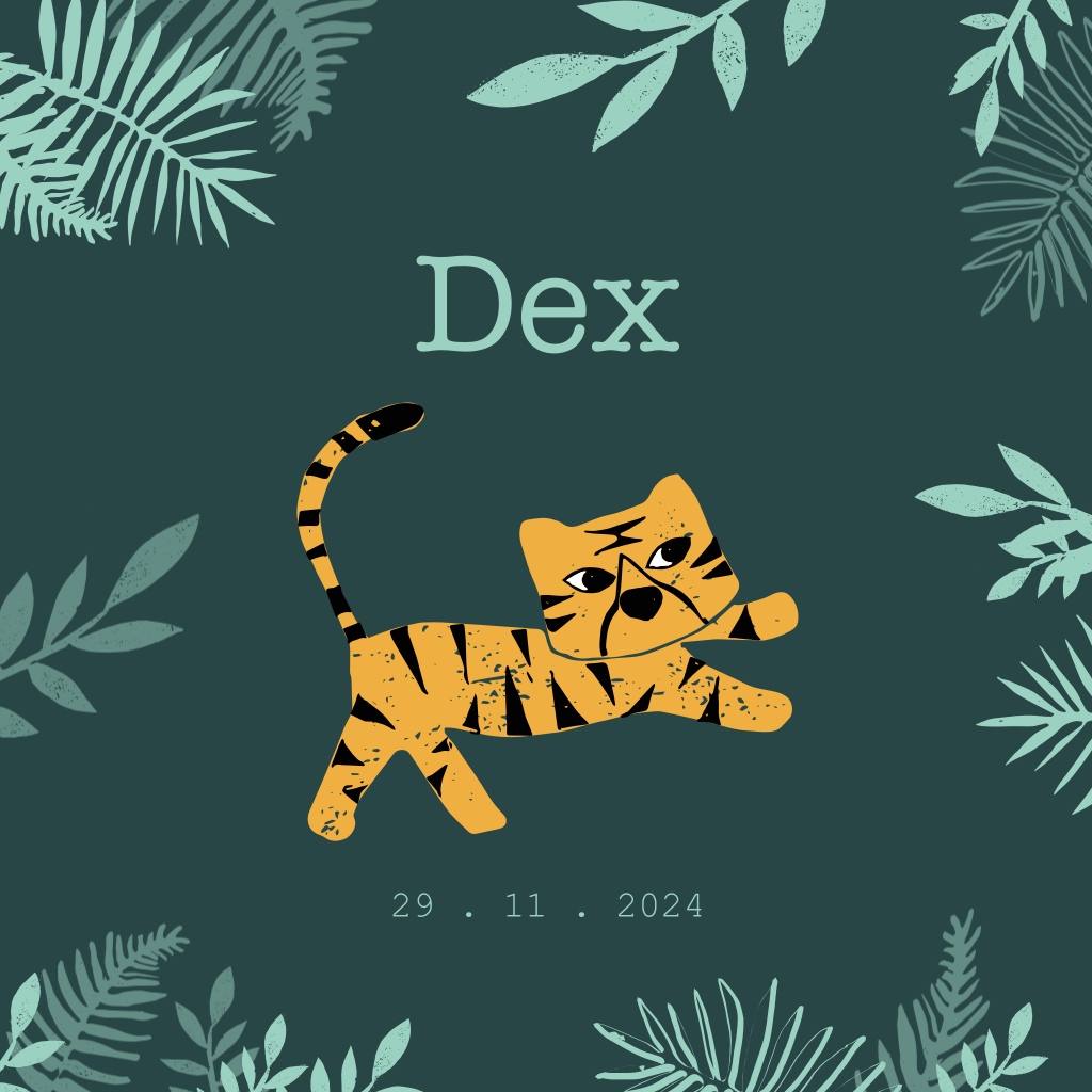 Dit unieke geboortekaartje is gemaakt met handgesneden stempels. Op het kaartje staat een stoere tijger. De donkergroene achtergrond en groene bladeren geven dit kaartje een echte jungle vibe. Pas de teksten en kleuren naar wens aan in de online editor.