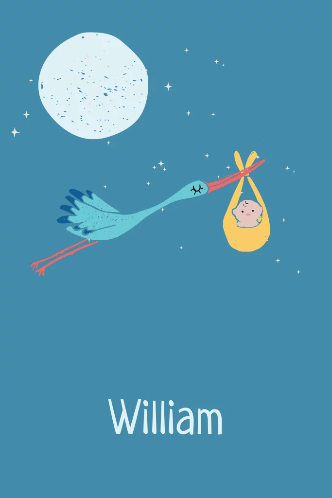 Een stoer, maar ook zeker lief geboortekaartje voor jullie zoon. Dit kaartje heeft een blauwe achtergrond met daarop een illustratie van een ooievaar. Daarnaast zie je een grote maan en sterrenhemel. Pas het ontwerp naar wens zelf aan.