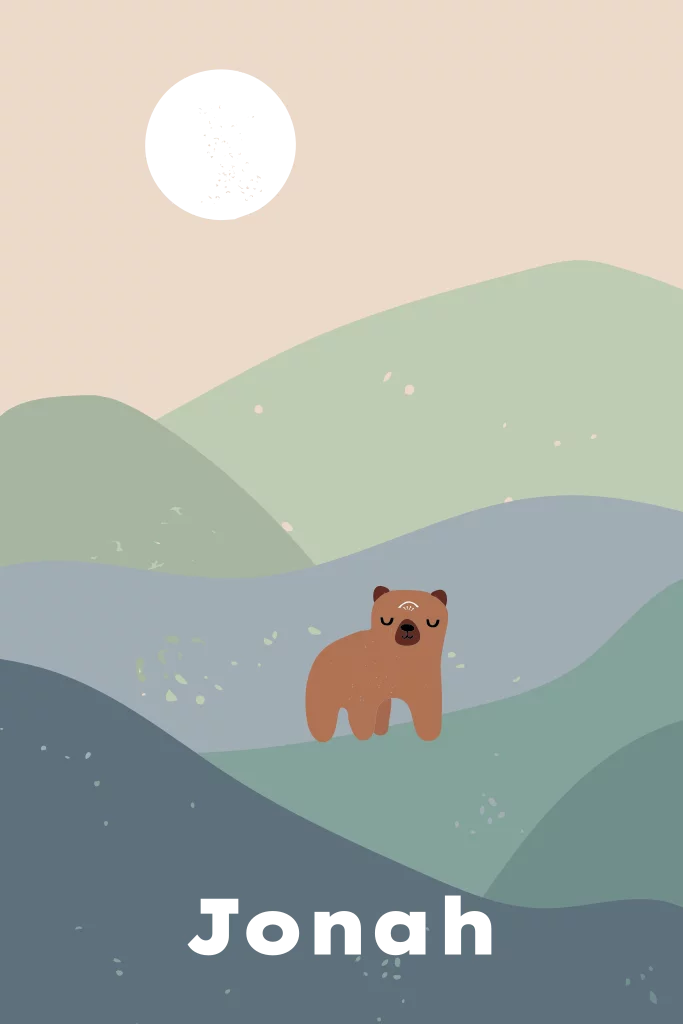 Tof geboortekaartje met goudfolie details. Je ziet een beertje in een berglandschap met groen blauwe tinten . De naam en zon wordt gedrukt in goudfolie.
