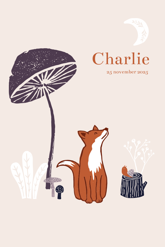 Verwachten jullie in herfst een kindje? Dan is dit lieve herfst thema geboortekaartje helemaal geschikt. Het kaartje heeft een illustratie van een vos, paddenstoeltjes en een maantje. De achtergrond van het geboortekaartje voor jullie kleintje heeft een beige kleur. In onze online editor kan je het kaartje volledig naar wens aanpassen.