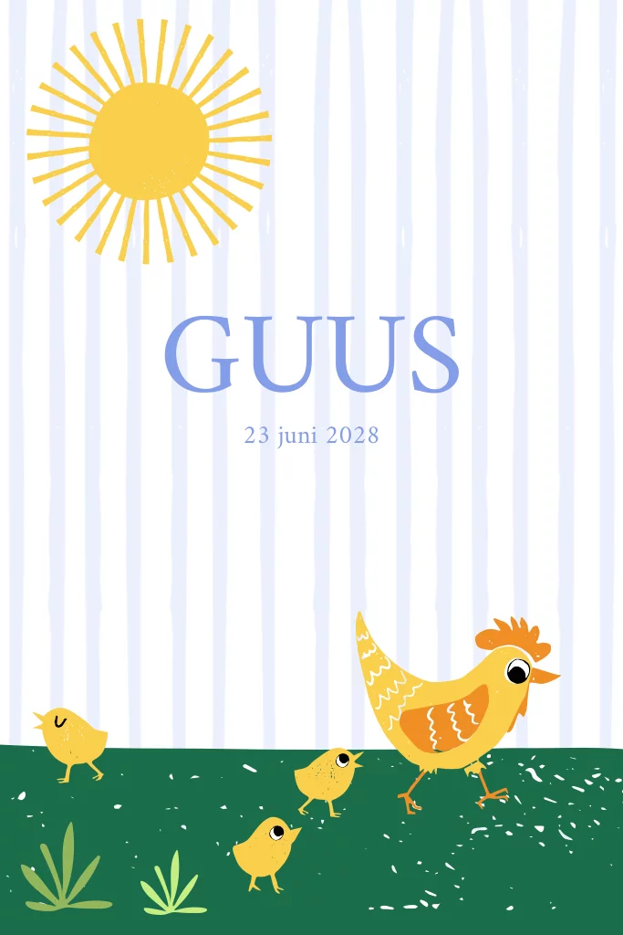 Wat een vrolijk geboortekaartje voor jouw kindje! Het kaartje heeft een gestreepte achtergrond met bovenin een zon. Daarnaast zie je het boerderij thema met een kip en drie kuikentjes. Pas het ontwerp naar wens zelf aan.