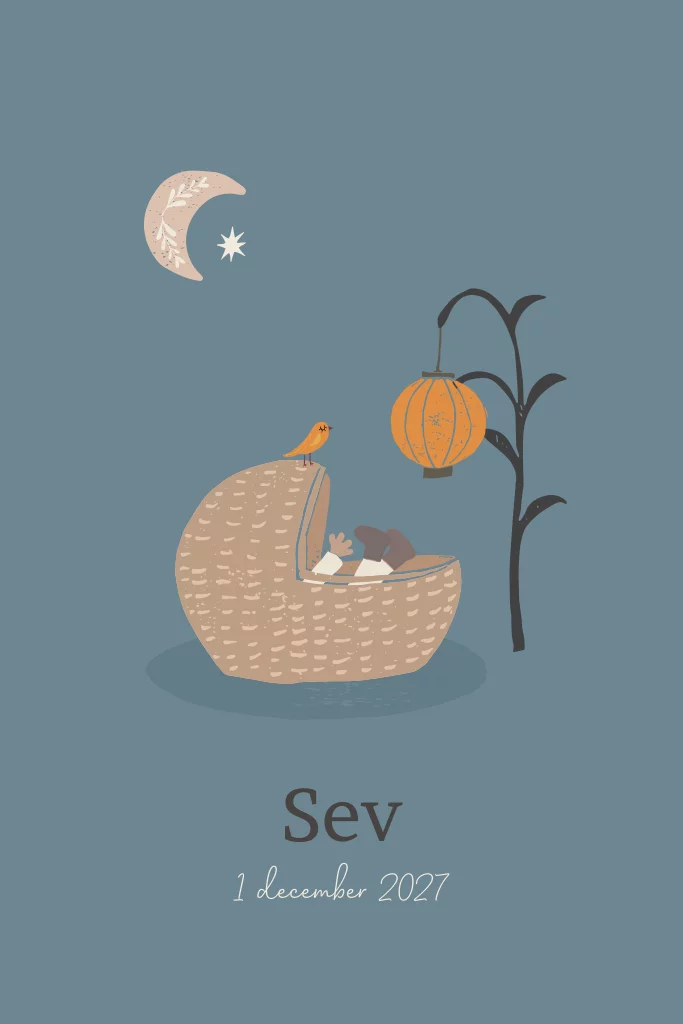 Een sprookjesachtig geboortekaartje voor jouw kindje. Het kaartje heeft een blauwe achtergrond met daarop een lieve illustratie van een wiegje onder de maan. Pas het ontwerp naar wens aan in onze online editor.