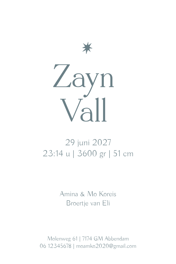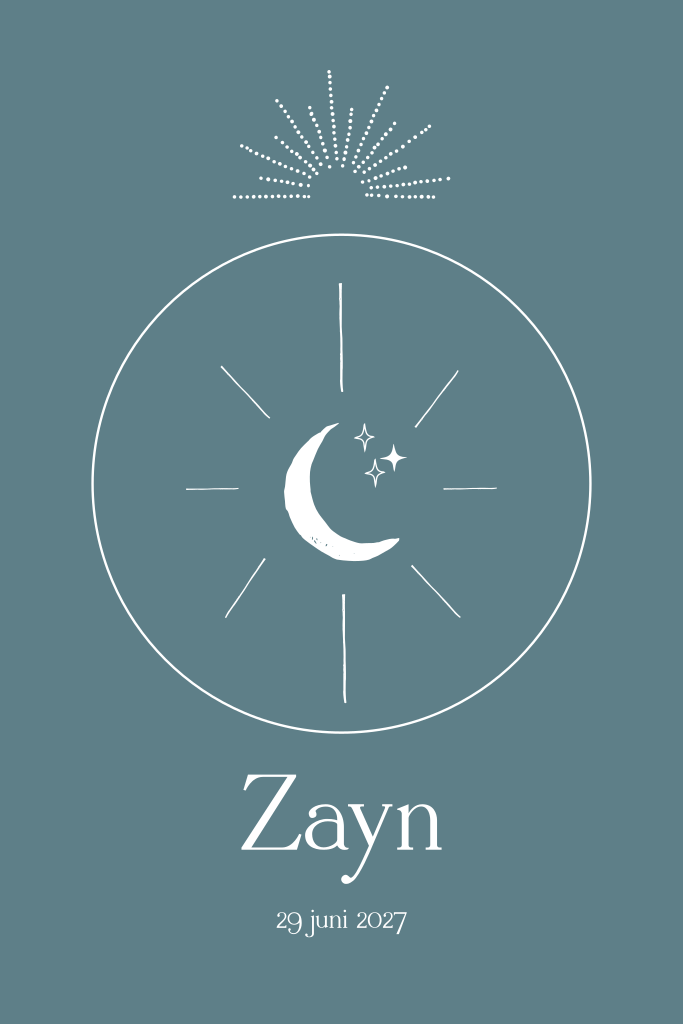 Een stoer en trendy geboortekaartje voor jouw zoontje. Het kaartje heeft een blauw structuur achtergrond met daarop prachtige goudfolie details. In het midden van een kaartje zie je een mooie maan met sterren gecentreerd in een cirkel. Pas het kaartje naar wens aan in onze online editor.