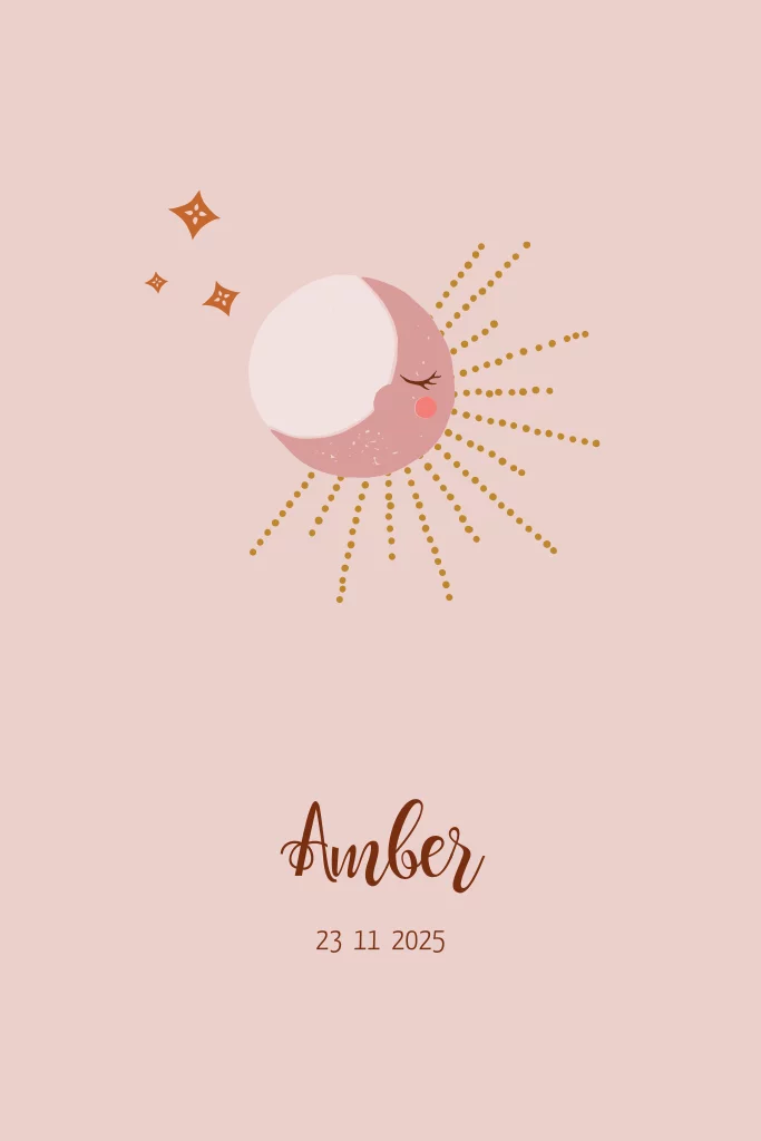 Dit is een lief geboortekaartje met een slapend maantje in roze tinten. Alle elementjes zijn gemaakt met als basis handgesneden stempels. Pas het kaartje naar wens aan in onze online editor.