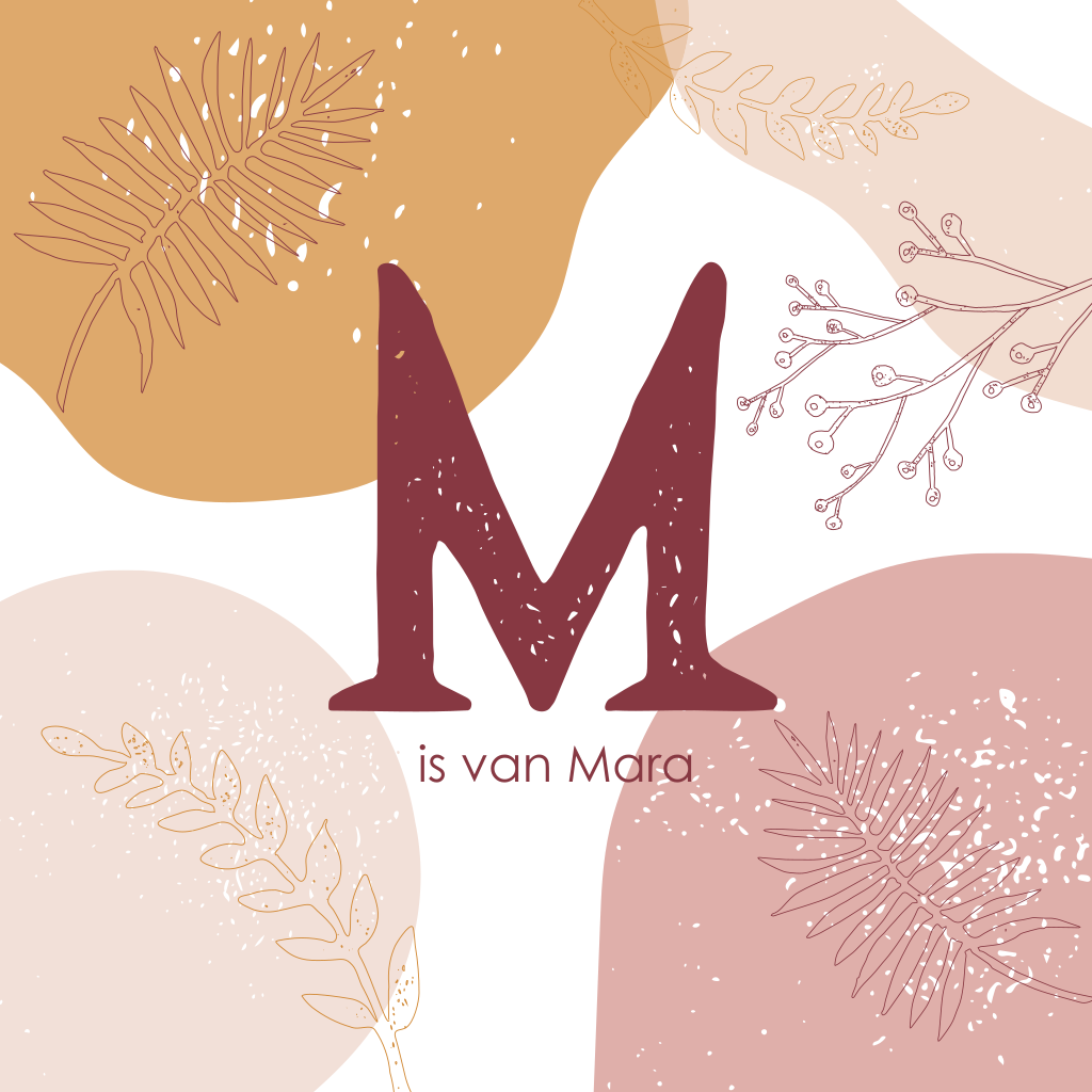 Dit geboortekaartje met beginletter, organische vormen en takjes is gemaakt op basis van handgemaakte stempels. Het kaartje is uitgevoerd in trendkleuren. De voorletter is in de online editor aan te passen naar iedere letter van het alfabet.