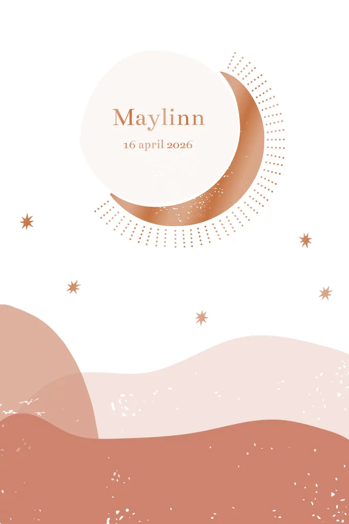 Een elegant en hip geboortekaartje met verschillende aarde tinten. Op het kaartje zie je een landschap van organische vormen. De maan en de sterren op het kaartje zijn gedrukt in hoogglans. Pas in onze online editor het kaartje naar wens aan.