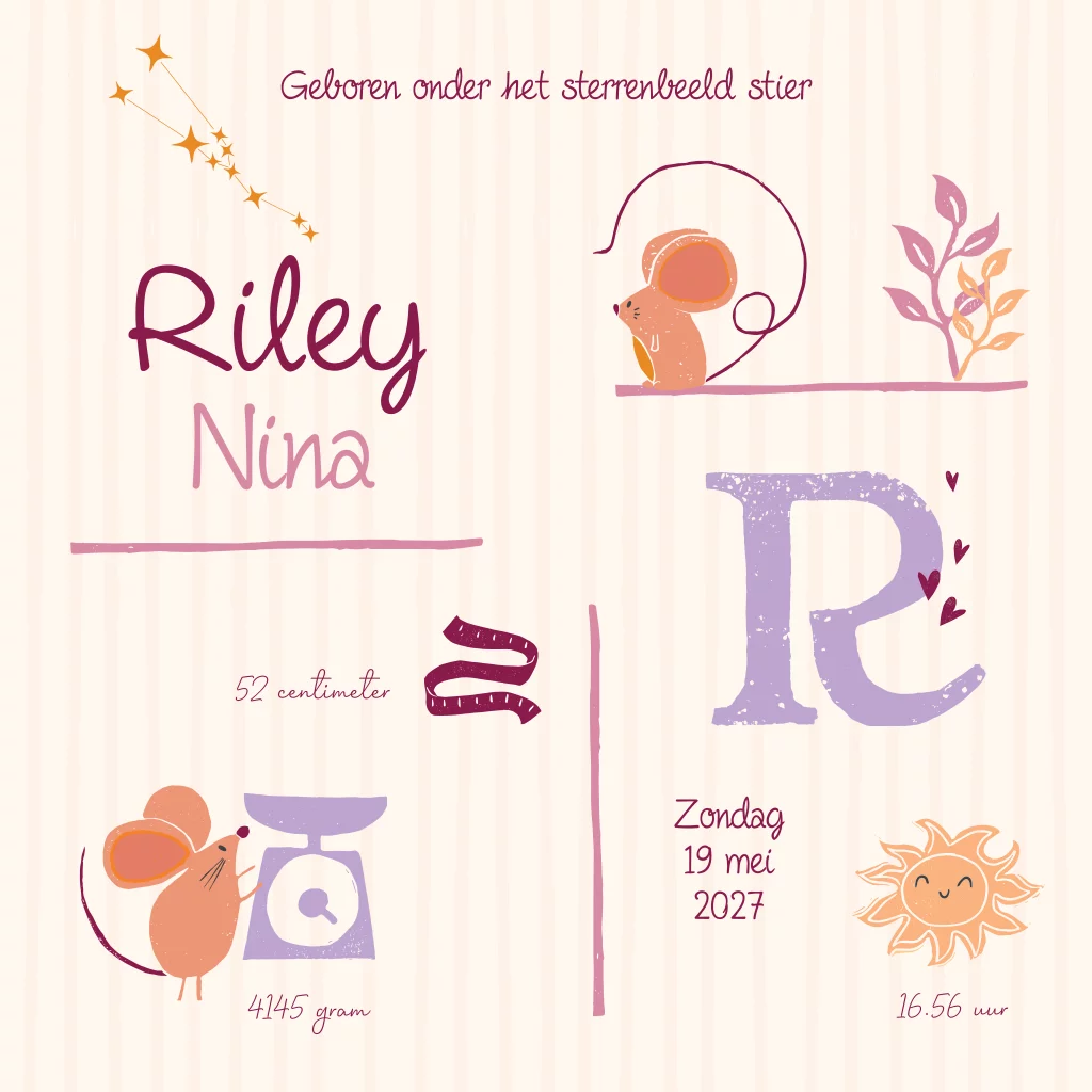 Een lief en vrolijk geboortekaartje voor jouw meisje. Het kaartje heeft een gestreept achtergrond patroon. Daarnaast zie je de verschillende geboortegegevens en lieve illustraties van muisjes en een zonnetje. Pas het ontwerp zelf in onze online editor aan.