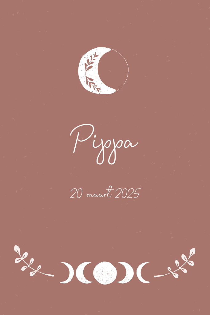 Prachtig minimalistisch geboortekaartje met een boho maantje en maanstanden. Het kaartje heeft ronde hoeken en krijgt daarmee een zachte uitstraling. De terracotta achtergrond en roséfolie accenten combineren mooi met elkaar. In onze online editor kan je dit kaartje volledig personaliseren. Bestel een proefdruk om het kaartje in het echt te bewonderen.