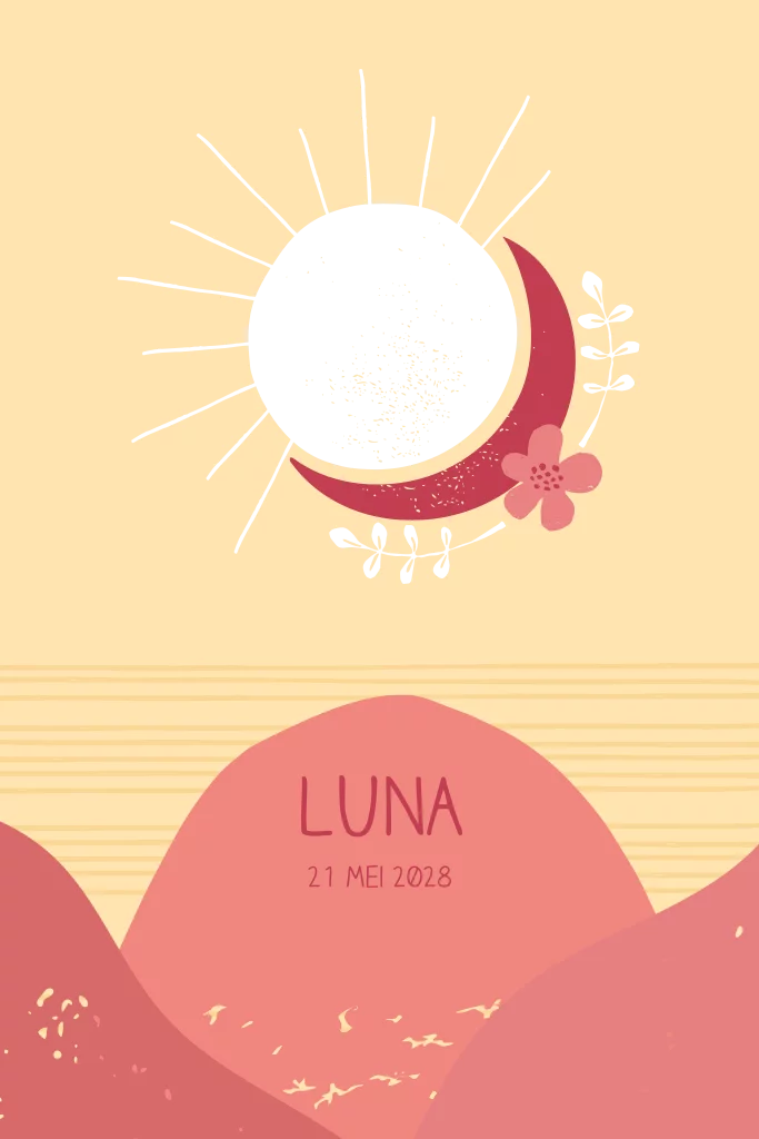 Een hip geboortekaartje met gele en roze tinten. Het kaartje heeft een berglandschap in warme tinten van een zonsondergang. De zon wordt gedrukt in goudfolie. Pas het ontwerp naar wens aan in onze online editor.