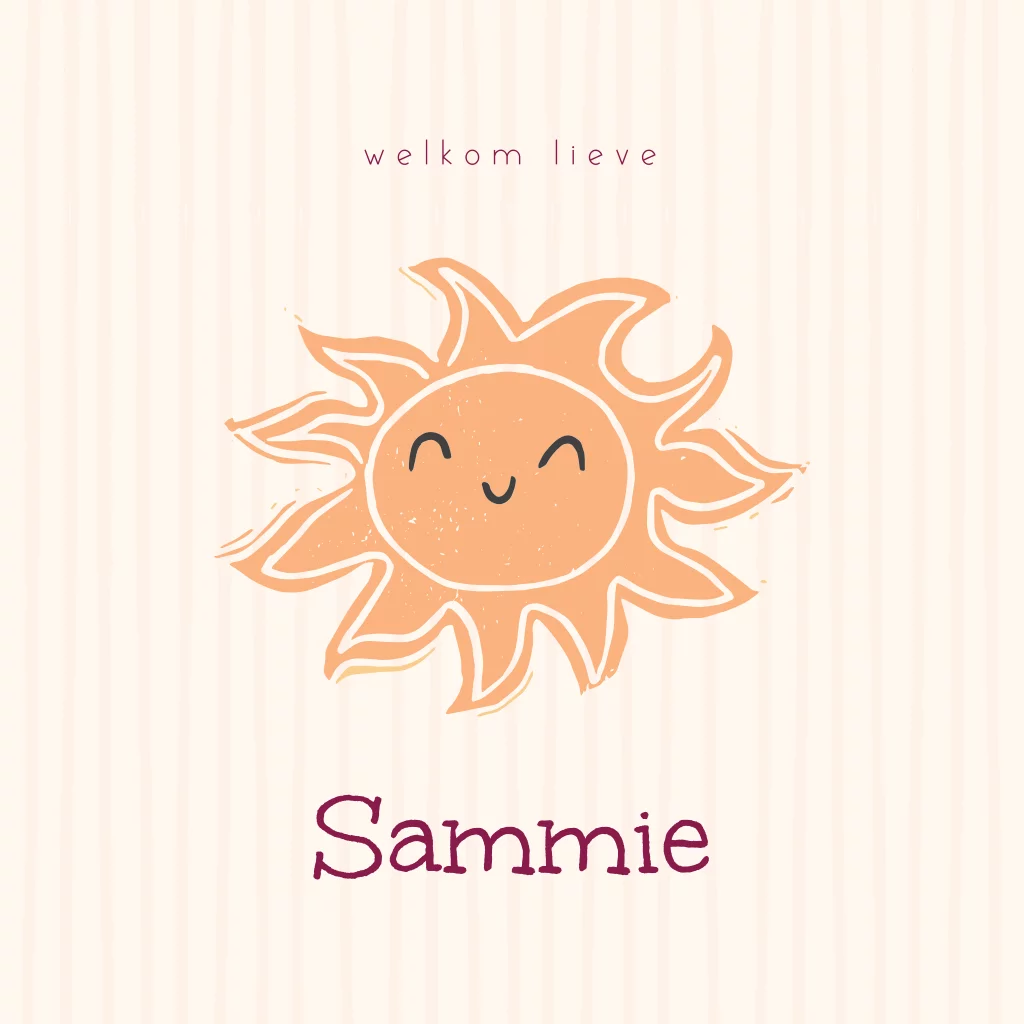 Een vrolijk rondhoek geboortekaartje voor jouw kindje. Het kaartje heeft een oranje/peach kleurig streepjespatroon als achtergrond. Daarop zie je een vrolijke illustratie van een zon. Pas het ontwerp zelf naar wens aan.