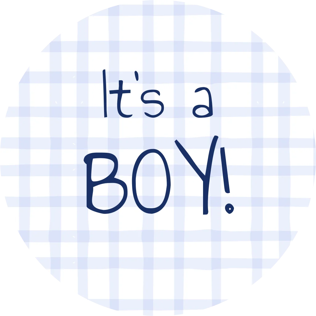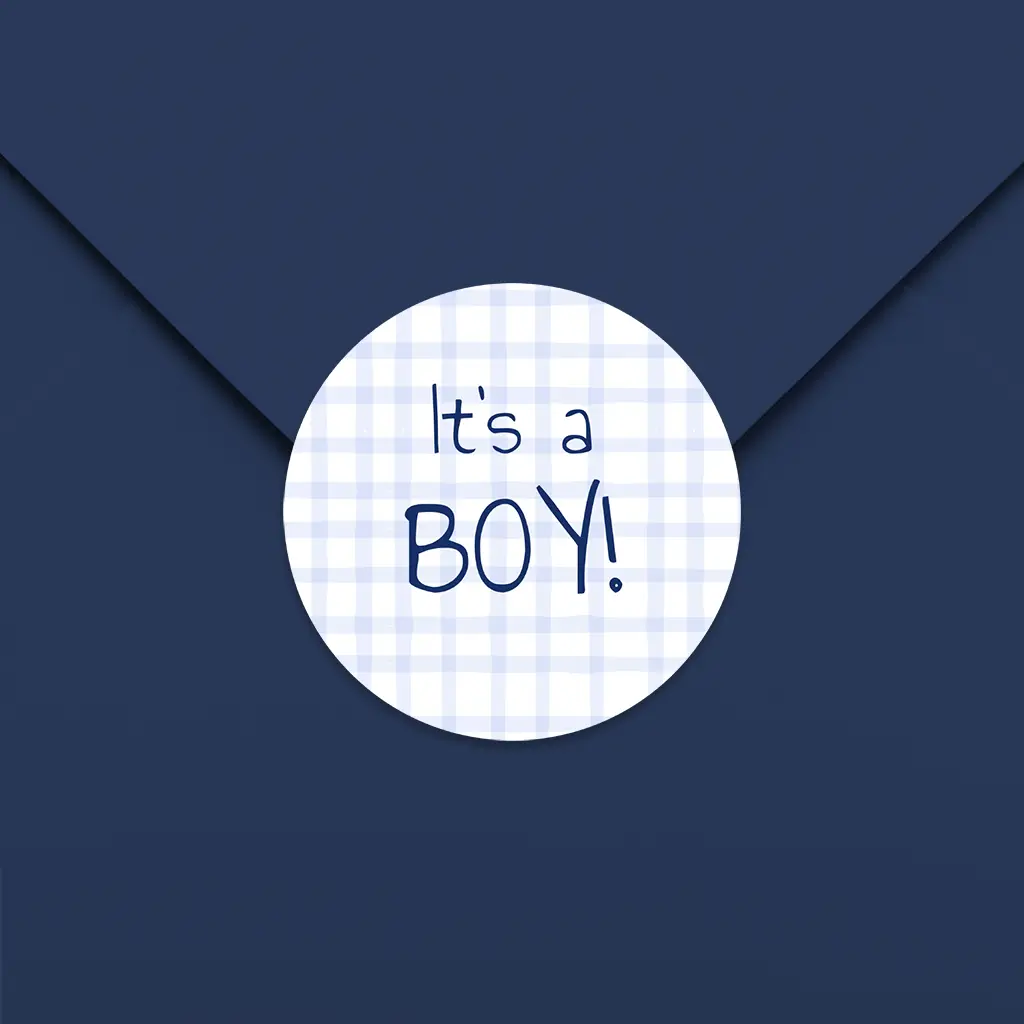 Sluitsticker it's a boy! Deze sticker heeft een blauw ruitjespatroon en de tekst 'it's a boy'. Personaliseer de sticker naar wens.